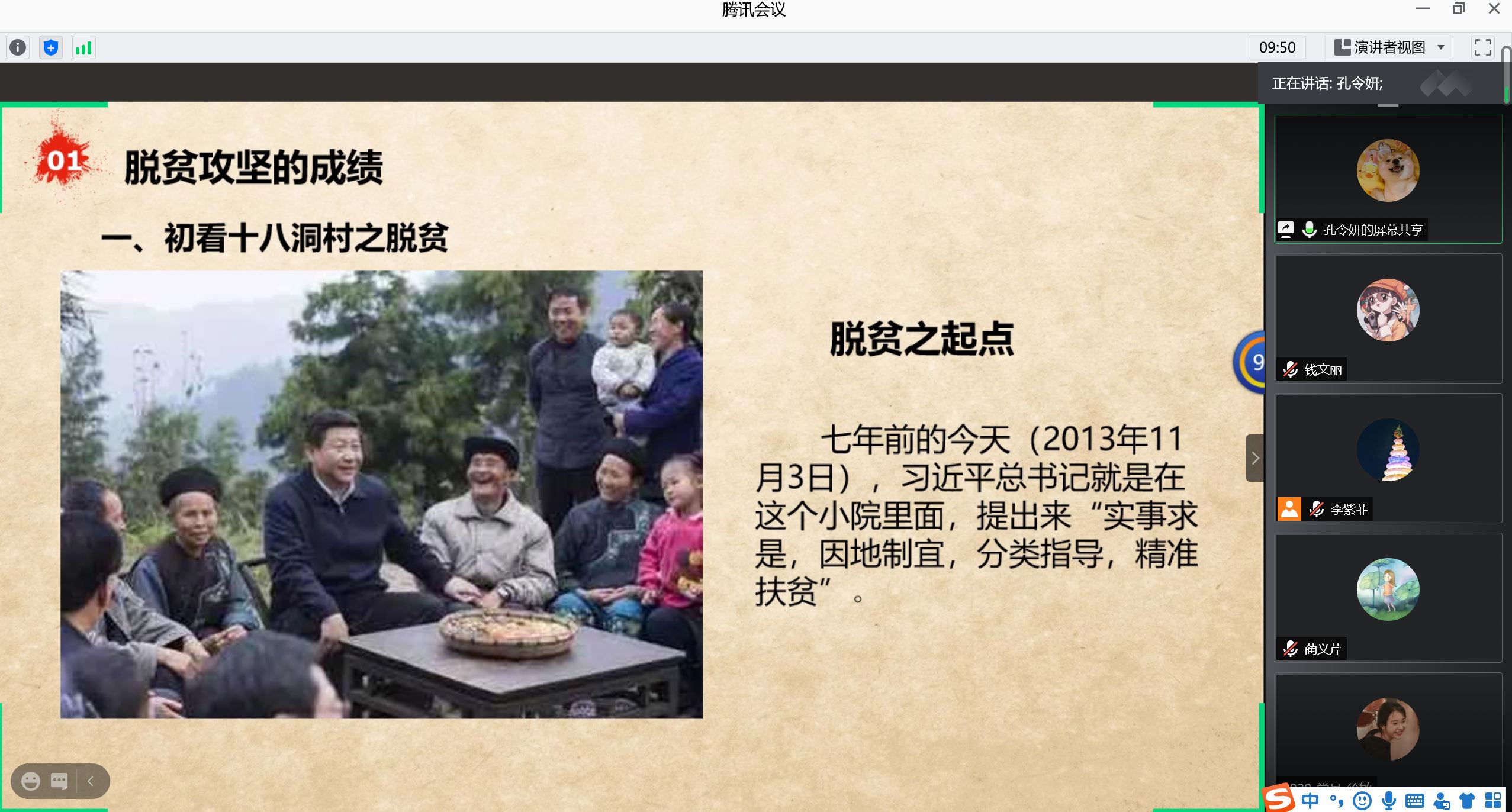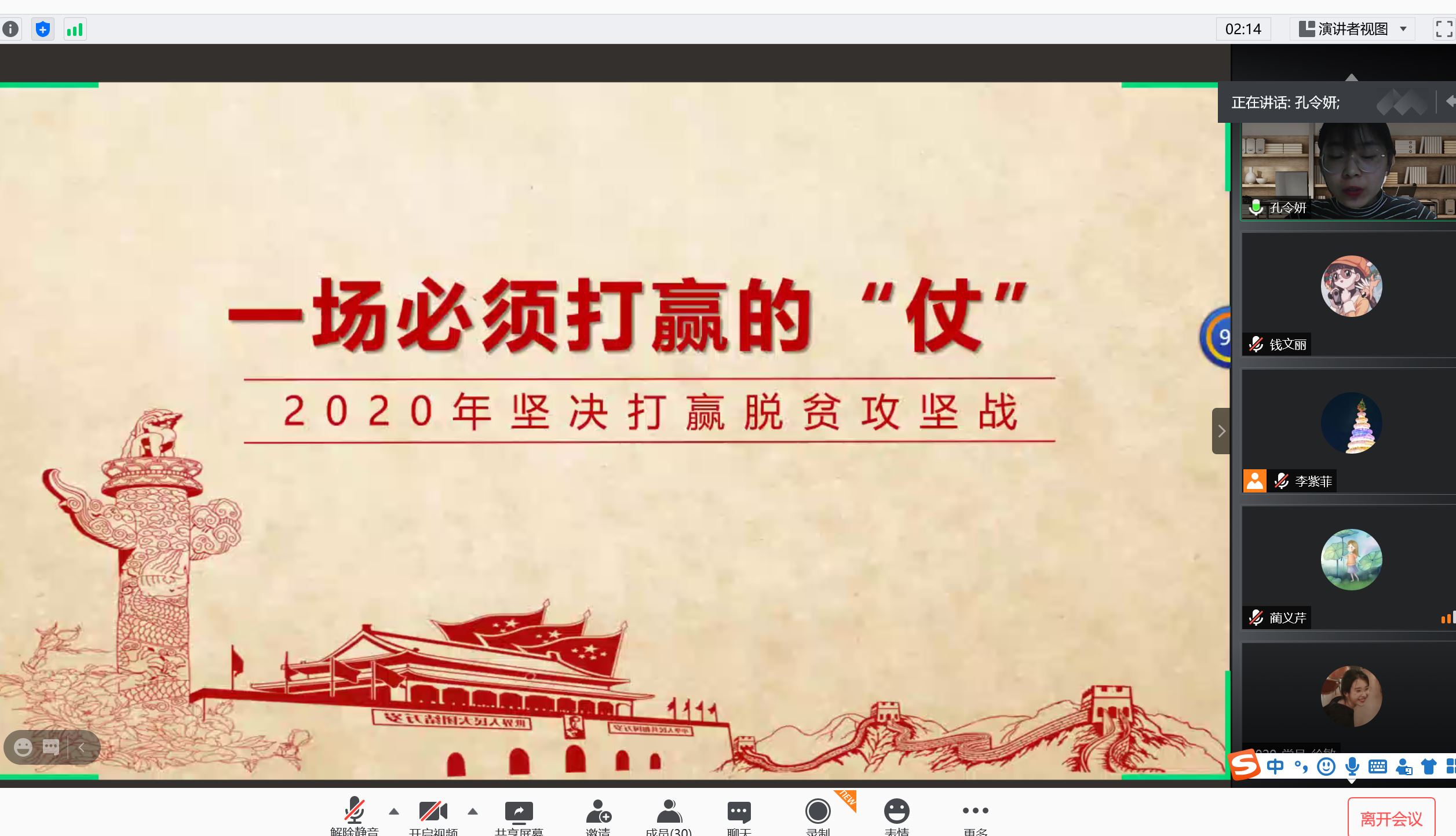 2020年11月12日晚17点至18点,欧洲杯 研究生第六党支部开展主题党日活动。党日活动的主题是“一场必须打赢的‘仗’——2020年坚决打赢脱贫攻坚战”,活动内容是邀请马克思主义学院宣讲团对脱贫攻坚的成绩、优势、风险和青年人在脱贫攻坚战中如何做进行讲解,活动目的是增加同志们对于脱贫攻坚的认识,增进大家对于打赢脱贫攻坚战的信心,增强青年党员的使命感和担当! 首先,研究生第六党支部书记李紫菲介绍宣讲员孔令妍。接着,在一段生动的视频中,党日活动正式开始。 之后,宣讲团通过对“精准扶贫”的由来和“十八洞村”故事的讲解生动地向我们展示了精准扶贫的效果。同时所展示的脱贫攻坚数据更让大家直接意识到脱贫攻坚成效之显著。 然后,宣讲团带领大家了解脱贫攻坚背后的优势,即党中央集中统一领导的领导优势,大扶贫格局的制度优势,经济优势和拥有巨大智慧的人民的群众优势。接着也对脱贫攻坚的挑战进行了讲解。 最后,在案例讲解和视频观看中,宣讲团结束了今天的主题宣讲活动,鼓励青年党员坚定信心,相信这场必须打赢的“仗”必将走向胜利,同时要保持努力奋斗的精神,迎接新生活和新挑战! 党日活动接近尾声,党支部所有成员依照惯例进行合影留念。 |