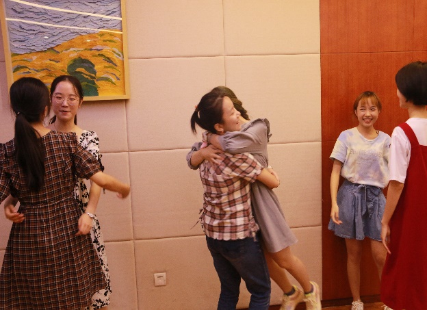 在活动的最后,小组内成员之间手握大拇指,形成一个漂亮的同心圆,并相互鼓舞,热情地喊出“有你真好,与你同行”的口号,整个游戏在一片欢声笑语中落下帷幕。 在分享自己参与本次活动的感受时,同学们给出的形容词有愉快、开心、温暖、热情等等,黄老师组织同学们一起为自己加油打气,并给予了大家真挚美好的祝福。