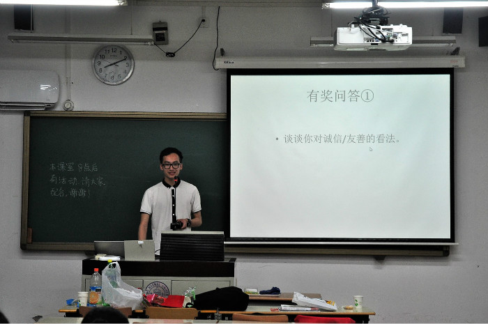 2018年4月26日晚八点,在欧洲杯 2017级本科四班班长王琢钧同学的主持下,四班同学在教四106开展了学习社会主义核心价值观的主题班会。学长导师郝明阳以及2017级本科四班的26名同学出席了本次班会。 首先,主持人王琢钧总结了运动会、五一假期以及军训的相关注意事项。随后,主持人为同学们解读了社会主义核心价值观中的“诚信”和“友善”,同学们观看了以诚信为主题的小品《诚信》以及歌唱友善的视频《友善歌》,并且发表了自己对于诚信和友善的看法。 本次班会重点为同学们解读了社会主义核心价值观中的“诚信”与“友善”,帮助同学们加深了对“诚信”与“友善”的理解。 会议记录|欧洲杯 2017级本科4班组织委员赵子豪 供图人|欧洲杯 2017级本科4班宣传委员安奕浓 供稿人|欧洲杯 2017级本科4班宣传委员安奕浓 |