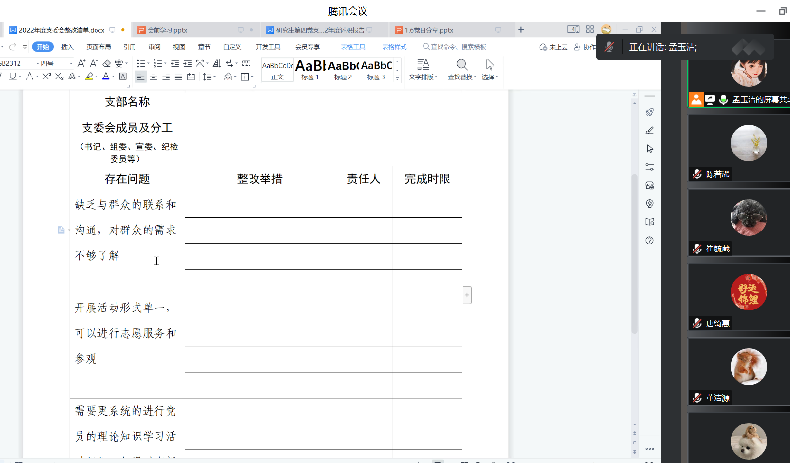 2023年3月8日8点30分,欧洲杯 研究生第四党支部成功召开2022年度党支部组织生活会和党员民主评议,会议通过“腾讯会议”线上开展。本次会议由党支部书记孟玉洁同志主持,共11名同志参与,内容主要分为三个部分:会前集中学习材料,开展批评和自我批评与支部评议,进行民主测评。