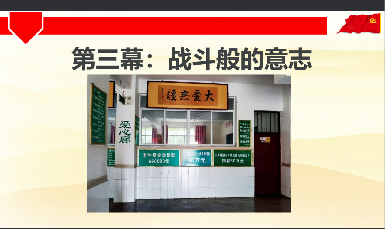 奏唱国际歌之后,刘爽同学通过“人生三章”带领大家学习了张桂梅校长从一名普通语文教师到一所免费女子高中的创办者的感人事迹。