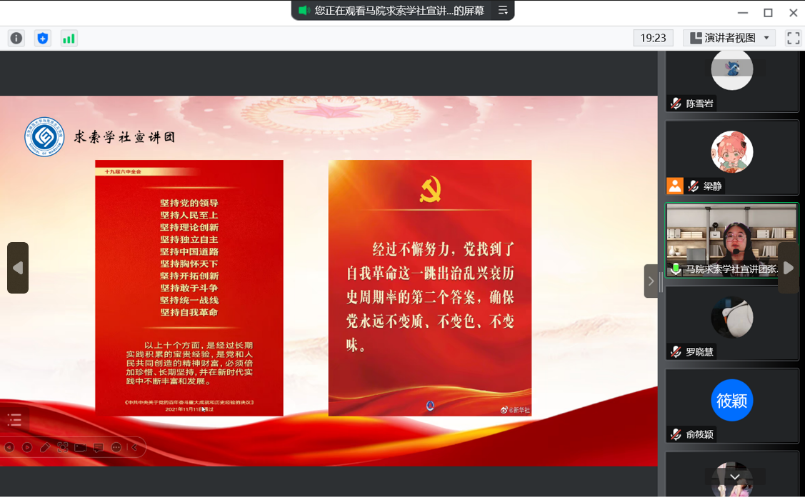 首先,梁静同志带领全体同志奏唱《国际歌》。 接下来,求索学社宣讲团成员张一帆同学开始宣讲。关于“第一个答案”,张一帆同学播放了一个视频。在视频中,毛泽东同志回答了如何跳出历史周期率,指出跳出的方法就是坚持民主,走群众路线,强调人民监督政府的重要性。
