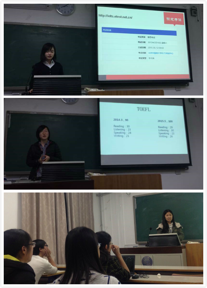 2015年12月5日晚,由心理学院分团委学习交流部主办的雅思、托福考试经验交流沙龙会顺利举办,本次交流会邀请到了心理学院2012级张乔茜、孙馨和张旭彤。 交流会上,张乔茜从推荐资料、考试题型等方面介绍了雅思考试相关内容。孙馨和张旭彤则向同学们推荐了托福备考书籍,分享了考试技巧与经验,并针对参考时间和考试报名提出建议。
