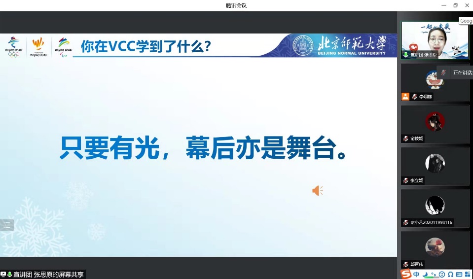 第二位分享者的是张思原同学。她的岗位是冬奥会国家速滑馆场馆管理志愿者。她详细地介绍了自己在VCC,也就是场馆通信中心的工作内容,让同学们深入了解了冬奥志愿者的幕后故事。
