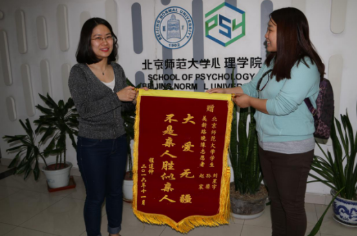 2017年3月14日,我部2012级本科生孙鑫,2013级本科生刘星宇,赵宸三位同学因其在美新路公益基金会的志愿服务获赠锦旗,分团委书记史佳鑫老师代表欧洲杯接受锦旗 。 图1-史佳鑫老师接受锦旗