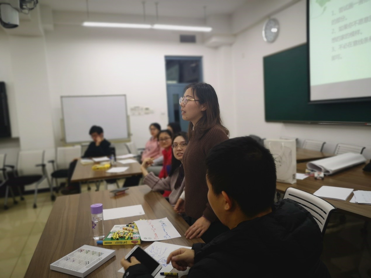 2018年12月19日14:30-16:30,由我部生活指导室主办的主题为“家庭关系:如何看待父母的影响”的暖心沙龙系列活动在教七504成功举办。 沙龙由一个热身活动“一闪一闪亮晶晶”开场,通过简单的动作,大家仿佛回到小时候的情境中——以善意的玩笑和他人构筑起联系。 热身活动之后,在黄利老师轻柔的语音引导下,大家进行了一次十分钟的冥想放松:想象自己是一只蝴蝶,看到父母年轻的时候,看到自己成长的历程…… 随后,大家从冥想状态清醒过来,在老师的引导下,用笔画出了自己内心的感受。大家的画作不尽相同,有具象的图案,也有相对意识流的作品……创作完成后大家先进行了组内分享,一开始气氛还有些沉闷,不过渐渐地,大家都开始愿意表露自己的想法,讨论也变得热烈起来。 随后,每一个小组都有一名成员进行分享,大家的经历不尽相同,分享的内容也各有侧重,不过共同的一点是:大家都真诚地表达了自己的感受。 下一个环节是关于“爱的五种语言”,活动过程是让小伙伴们写下父母或者其他主要抚养者对自己使用最多的爱的语言。同时小伙伴们需要投票选出自己最爱用的两种爱的语言,并且粘贴在纸板上。这是大家经过一番努力得到的投票结果,女生是红色的,男生是黑色的。由投票结果可以反映出:女生比较喜欢“精心的礼物”和“身体的接触”。这一点和老师上公选课中得到的结果是相同的。可见群体的集体意识多么强大。 小伙伴们写下父母对自己的爱。通过这种方式,把父母对自己的爱摆了出来,让所有人都知道父母是这样爱自己的。是不是很有趣呢?同时小伙伴们也勇敢地亮出了自己表达爱的方式,告诉别人,我是这样爱别人的,是不是很高兴轻松愉快呢? 接下来是很刺激的一个环节:体验冲突的五种应对方式。分别为:指责型、讨好型、打岔型、超理智型、真诚型。废话不多说,看图片就知道有多么有趣。 指责 讨好 打岔 超理智 真诚 在此环节的交流中,同学们各抒己见,谈论得激情澎湃,大部分人不喜欢打岔型和超理智型。黄老师的点评也是起到了画龙点睛的作用:打岔很多情况是在逃避,或是不重视问题。超理智型是对事不对人,看起来没什么问题,但是却会忽略了彼此的感受和联结,容易伤了人心,引起更多矛盾。小伙伴们在此环节的收获也是非常多!体会到了矛盾的各种应对方式,表达了对这些处理方式的看法。 在整场活动的最后,小伙伴们纷纷表达出了参与活动后,内心最深处的感受。 小伙伴们在谈论活动感想 有人说:没有永远的朋友,只有永远的利益。但是爱恰恰相反,没有永远的利益,只有永远的爱。爱是伟大的,爱让人温暖。我们接受别人爱的同时也要表达出来自己的爱。爱的五种语言恰恰是我们需要的。 父母爱我,我爱父母。爱不需要藏在心里,爱要表达出来。正如《真的爱你》这首歌中所唱:带出温暖永远在背后……请准我说声真的爱你。 (李月阳、张昱凌供图供稿) |