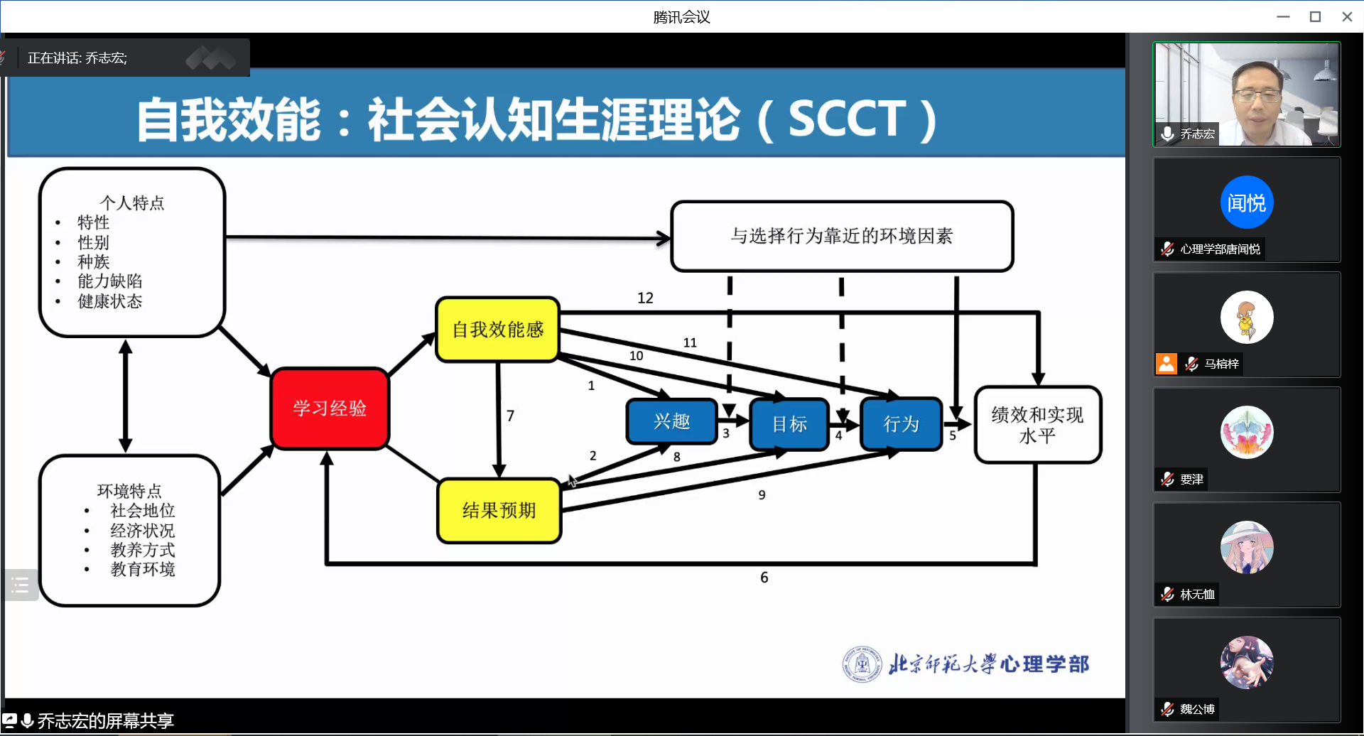 最后,乔老师解读了更真实的 “生涯发展历程”。人真正要价值引领,要自我驱动,必须要形成属于自己的目标。然而人生本无意义,藉由本能的天赋和好奇心,开始学习并形成经验,从而对自我进行判断,这样的自我概念帮助我们选择新的行动目标,形成新的经验,这个过程不断往复,生涯的疆界不断扩大,道路越走越远,永无尽头,永远乐观。 在当今时代背景下,工作是为了实现个人价值,想要实现个人发展与国家发展的有机结合,只有个人将国家需要视为个人价值才具有现实意义。那么如何寻找方向呢?乔老师借助心理学相关的“自我效能理论”和“生涯建构理论”,指出个人职业生涯发展两大关键点: “行动构成生涯”:不需要去期待别人告诉你应该干什么,寻找你生命的渴望,以此为出发点积极行动,因为行动是职业生涯最根本的要素; “赋义形成主线”:在行动过程中定义自己,这种意义感逐渐成为我们职业生涯发展的主线,当你回头看时,会发现一条完全不同于别人的道路。 本次讲座中,乔老师结合心理学理论,生动形象地讲解了探索职业发展道路的机遇与挑战,相信能够对同学们职业生涯发展起到一定指导作用。