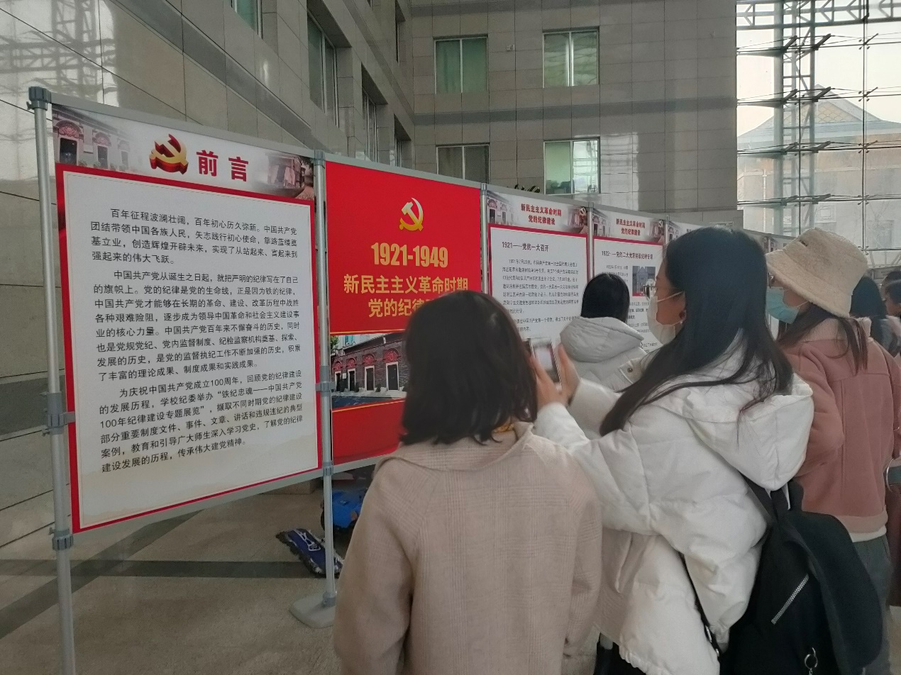 陈作为:参观纪律建设展,想到今天上午的讲座上,李娟老师说,革命年代师大没有出过一个叛徒。而与此相反,与师大并蒂花开的另外某校,有举报李大钊的,有张国焘之流云云。可见,才盛未必厚德,高调难为忠诚。何况才盛也未必见得。学为人师重要,但更重要的是行为世范。 张涵宇:前言中的一句“党的纪律是党的生命线,正是因为铁的纪律,中国共产党才能够在长期的革命、建设、改革历程中战胜各种艰难险阻,逐步成为领导中国革命和社会主义建设事业的核心力量”总结了展览的主题。刘青山、张子善、周永康、徐才厚、令计划…从共产党成立至今,有一些领导干部和党员同志经不起资产阶级的腐朽思想和生活方式的侵蚀,逐渐腐化堕落,成为人民的罪人。但也有像向警予、江姐这样的革命英烈用生命守护党和国家、人民,以及张富清老兵这样始终坚守初心、全心全意为人民服务的人。“不忘初心,牢记使命”,短短的八个字,却是我们真正要铭记在心,并时刻践行的信念。 陈栈:第一次以入党积极分子的身份参与党支部的发展大会和参观活动,我十分开心。第一次参观的内容就是关于中国共产党关于纪律建设的历史发展,纵观我党发展历史,对于党规党纪的强调从未停止,反腐败斗争至今仍在进行,不论是多大的“老虎”,我们都要有壮士断腕、搞好纪律的决心。参观我党纪律建设的历史,是我第一次以积极分子的身份参与的党员活动,这对我意义非凡,在今后的党员发展过程中也会一直提醒自己严守党规党纪,拒绝任何违纪行为。 周婧怡:一直以为从严治党是最近的事情。看了这次的展览之后才知道我们党在纪律方面的管理一直在路上,对严肃党内纪律的要求一直没有放松,没有改变。过程中也会出现问题,但可以看到都非常及时地出台相关办法修正方向。也许现在党的内部还有一些心术不正的人,但在严格的纪律管理下,这样的人一定会越来越少,真正为人民做实事的党员会被看见! 柏霁容:通过今天的展览,我意识到从党建设初期,党就开始注重纪律问题以及反贪污腐败的工作在党的早期就开始开展。1926年,中国共产党就发布了历史上第一份惩治贪污腐败分子的文件。这份文件也正式成为了开展反贪污腐败工作的实践起点。展览中还介绍了很多正面榜样和反面事例,这都值得我们深入的学习和思考。我也会牢牢记住党的纪律是党的生命线,严格要求自己,向做实事、为人民的党员学习。 邹子兰:纵观党的纪律发展历史,不同的时期有着不同的历史特点,新民主主义革命时期侧重的是对党的队伍的建设和对人民的态度,社会主义革命时期侧重对党的组织成分和党员素质建设,改革开放时期侧重的是对国家法律、党的政策方针的强调,现在则是更强调牢记初心,进行反腐败斗争。但不论是哪一个时期,我们都可以看到,党的纪律都是在围绕“对内建设政治清明、纪律严明的党员队伍,对外约束党员自身不侵犯人民的利益”进行的。党用铁一般的纪律证明“为人民谋幸福”从来都不是一句空谈。 钱文丽:从展览中可以看到我们党不论哪个时期都一直注重纪律建设,而勇于自我革命也是中国共产党区别于其他政党的显著标志。党的十八大以来反腐败斗争的成效有目共睹,周永康、徐才厚、令计划等人也是我作为新时代青年耳熟能详的“老虎苍蝇一起打”中的典型案例。印象很深的是,邓小平同志说国家建设和团结“一靠理想,二靠纪律”,作为一名中国共产党党员,我们要心中常怀理想,时刻遵守纪律,守好初心,不忘使命! 王淏蘭:展览回顾了党的纪律建设的发展历程。在整个展览中给我印象最深的,最能结合自己切身感受的还是当属“党的十八大以来反腐败斗争的成效”板块。党的十八大以来,以习近平同志为核心的党中央坚持打铁必须自身硬,把全面从严治党纳入“四个全面”战略布局。反腐败斗争取得压倒性胜利并全面巩固,党在革命性锻造中更加坚强有力。作为入党积极分子,更要加强对全面从严治党的规律性认识,增强主动扛起全面从严治党主体责任的思想认同和行动自觉,不断提高纪律意识,自觉遵守党规党纪,为师大“双一流”建设努力奋斗,为实现中华民族伟大复兴的中国梦贡献力量! 邹昕童:1926年发布《坚决清洗贪污腐化分子》是党的历史上第一份惩治贪污腐化分子的文件,是开展反腐工作的实践起点。多年来,党一直致力于肃清党内一切贪污腐败反动势力,十八以来,党中央在统筹推进思想、组织、作风、反腐倡廉和制度建设的实践中,针对全面从严治党面临的形势和任务,强调“加强纪律建设是全面从严治党的治本之策”。充分认识到纪律建设的重要性,是保持党的纪律严明的前提。 刘晨淼:学习政治理论的时候,我们总把党要管党,从严治党挂在嘴边,却很少思考靠什么管,凭什么治。今天参观了中国共产党100年纪律建设专题展览,明白了严明纪律是全面从严治党的治本之策。在党的六类纪律中,廉洁纪律一直以来都是纪律建设的重中之重。人性都有软弱的一面,面对金钱的诱惑,一大批党员同志犯了错误,甚至还有曾经的国家领导人。这些教训提醒我们,要时刻保持警惕,严守党员的行为准则,为人民服务,为中华民族伟大复兴奋斗。 刘津均:没有规矩不成方圆,党的纪律是我们党的每名成员都必须遵守的基本规矩。随着我们党的发展壮大,党员越来越