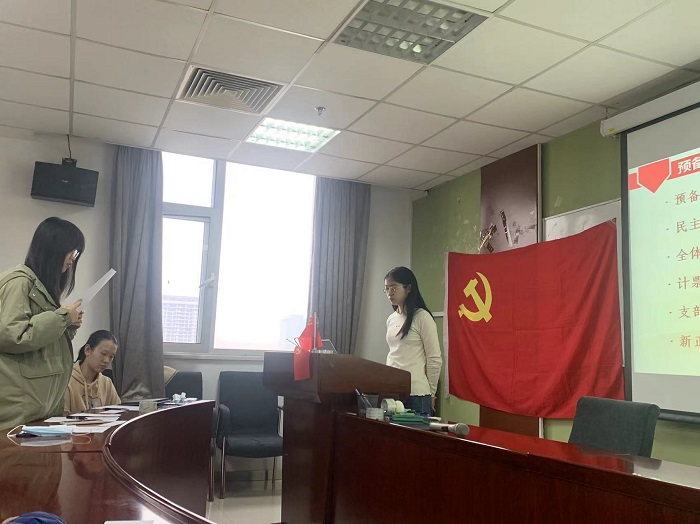 首先,全体参会人员面向党旗起立,齐唱《国际歌》。随后,支部书记廖晨曦介绍转正流程。 之后,预备党员杨晟妮、关岳琳、梁静分别向党组织汇报了她们在预备党员期间的思想、工作和学习各方面的表现。她们均能够正确地认识了自己的不足,同时也表明在成为正式党员后,会不断完善和提高自己。