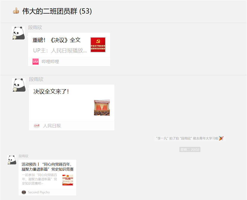 入党积极分子,获奖同学常育嘉说:很高兴参与这个活动,和大家一起学习党的十九届六中全会的精神,在答题中一起进步和成长。党的十九届六中全会,是在我党成立一百周年的重要历史时刻,在党和人民胜利实现第一个百年奋斗目标的重要历史关头召开,具有十分重大的历史、政治、理论和现实意义。作为新时代新青年,我们应该奋发前进,积极学习理论思想,不断向未来拼搏前行。 通过本次活动,三个支部将党史学习教育继续走深走实;团员们深入学习了十九届六中全会精神,进一步体会了党的百年奋斗征程,立志为实现第二个百年奋斗目标奉献青春力量!