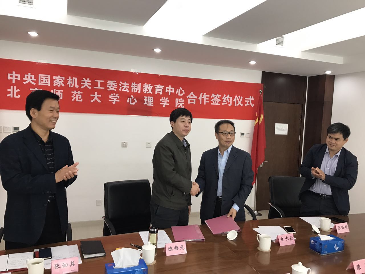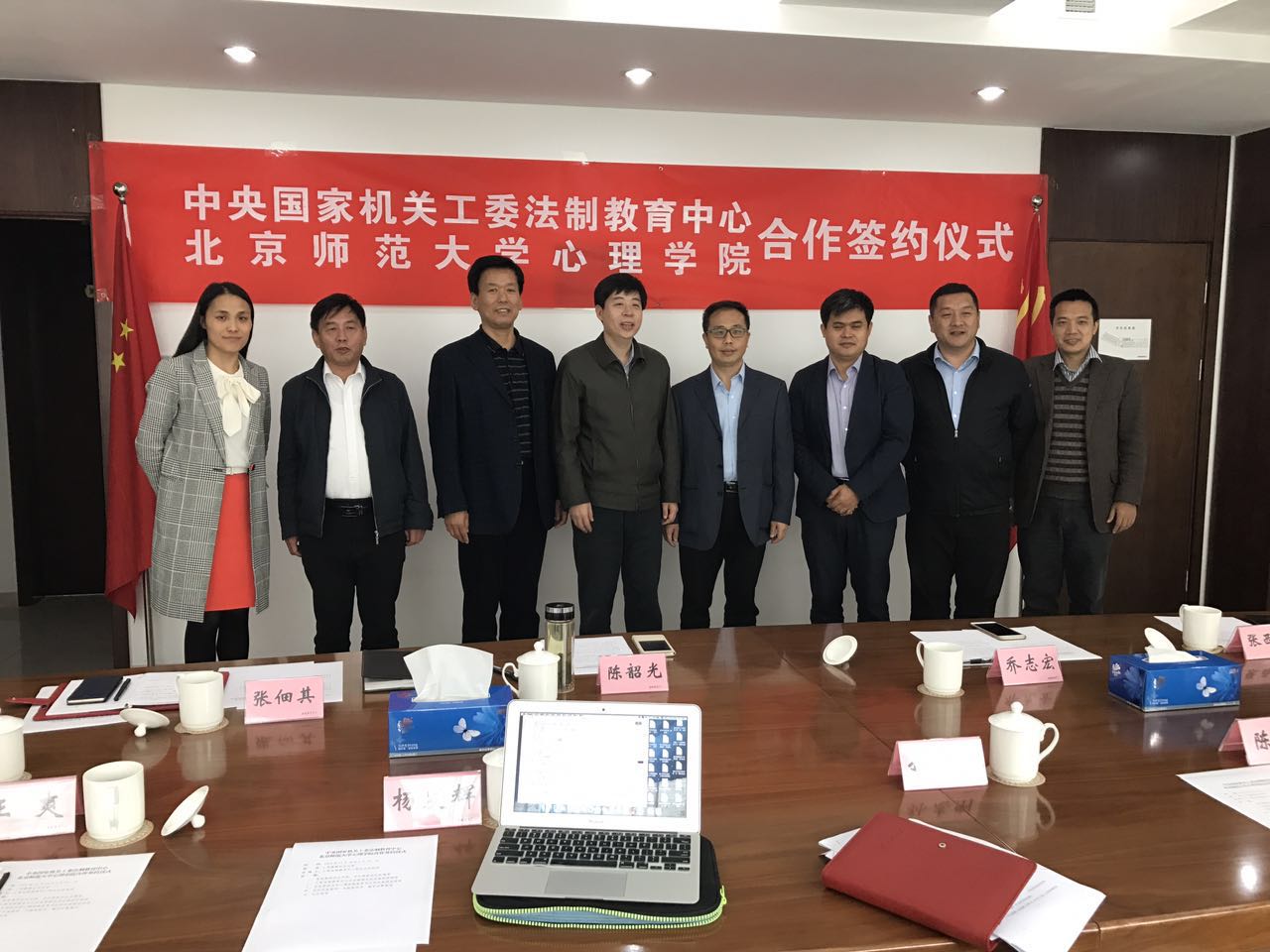 2016年10月18日上午,我院分党委书记乔志宏、张西超教授、心理健康服务中心督导师杨发辉老师前往中央国家机关工委法制教育中心,就共建中央国家机关心理健康服务基地建设相关事宜进行深入讨论,并达成合作意向,会后举行了签约仪式。 我院一行人受到了工委法制教育中心主任陈韶光、副主任张佃其等的热烈欢迎,在相关人员的陪同下参观了中央国家机关心理和体质健康服务基地,并与中心领导进行了会谈。 图一 参观中央国家机关心理和体质健康服务基地 陈韶光主任简要介绍了基地的相关建设背景,该基地是根据中央国家机关党员干部需求,以身、心、灵作为基地的整体服务导向,历时半年建成,北京师范大学心理学院作为该基地的专业技术依托单位,给予了大力支持,希望以后能在心理课程设计、师资选配、培训服务方面进行深度合作。 图二 参观中央国家机关心理和体质健康服务基地 分党委书记乔志宏教授表示很高兴能进一步加强合作,将我们所学、所用、所知能用到促进公务员心理健康中来,同时促进我院的人才培养工作。书记乔志宏建议在进一步加强合作的基础上,可以联合开展公务员心理健康的基础性研究,同时研究如何将中心购买的设备与培训课程更好的结合,形成特色服务体系。张西超教授充分肯定了这种合作的必要和广阔的前景,将心理专业、设备和该中心优美的环境相结合,能达到事半功倍的效果。 双方在充分讨论达成合作意向后,举行了签约仪式。 图三 签约过程中 图四 签约完毕双方正式达成合作意向 图五 签约结束后双方合影