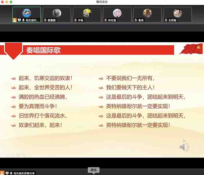同志们在聊天区踊跃发言:对于如何促进教师资源均衡配置、促进教育公平,王凯芃同志和邬宇镇同志都强调了“提高教师待遇”“适当政策倾斜”的重要性;李铭同志从自身出发,谈到作为一名公费师范生,享受了国家给予的很多帮助,决心在大学毕业后回到家乡云南从事一线的教学工作,培养德智体美劳全面发展的社会主义建设者和接班人……在同志们的讨论中,本次会议圆满结束。 欧洲杯 本科生党支部 供图供稿:颜露懿、谭静文 |