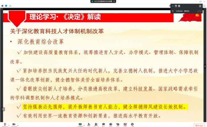 黄彤彤同志从“关于经济和民生领域改革”、“关于深化教育科技人才体制机制改革”、“关于党的领导和党的建设制度改革”等三方面详细解读了《决定》中所提到的相关改革政策。在解读“关于深化教育科技人才体制机制改革”这部分内容时,黄彤彤同志强调了“坚持强教必先强师,提升教师教书育人能力,健全师德师风建设长效机制”这一项措施,并鼓励党支部的同志们结合大学的培养及教育内容来理解这一理论精神,为我国的强师强教改革贡献自己的力量。