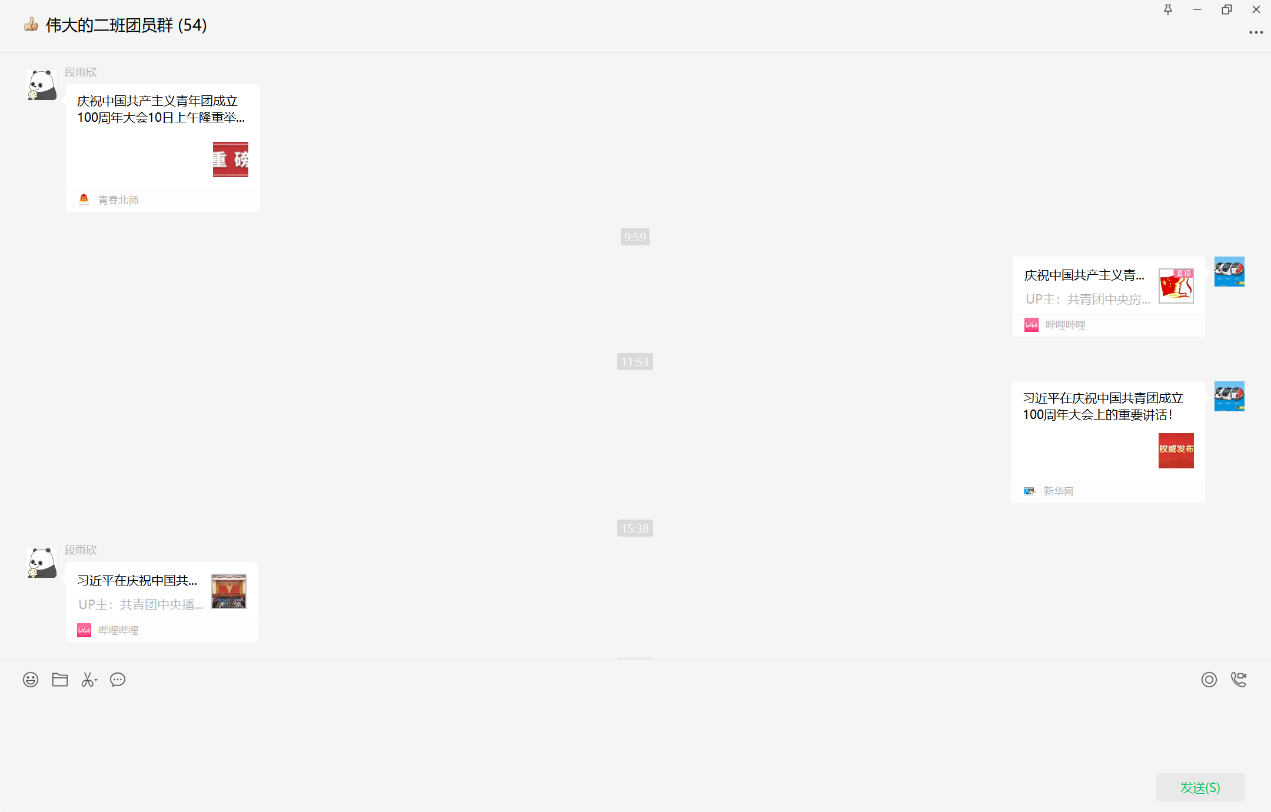 庆祝中国共产主义青年团成立100周年大会5月10日上午在北京人民大会堂隆重举行。中共中央总书记、国家主席、中央军委主席习近平出席大会并发表重要讲话。在讲话中,习近平总书记对共青团组织和共青团员提出了期望,新时代的广大共青团员,要做理想远大、信念坚定的模范,带头学习马克思主义理论,树立共产主义远大理想和中国特色社会主义共同理想,自觉践行社会主义核心价值观,大力弘扬爱国主义精神。我支部组织团员收看、学习了总书记重要讲话,我支部团员志做新时代中国青年,不负时代,不负韶华。 大会进行期间,支部组织没有课程的同学收看直播,会后在支部群中分享习总书记重要讲话全文和讲话回放,确保每一名团员青年学习、领会了会议精神。