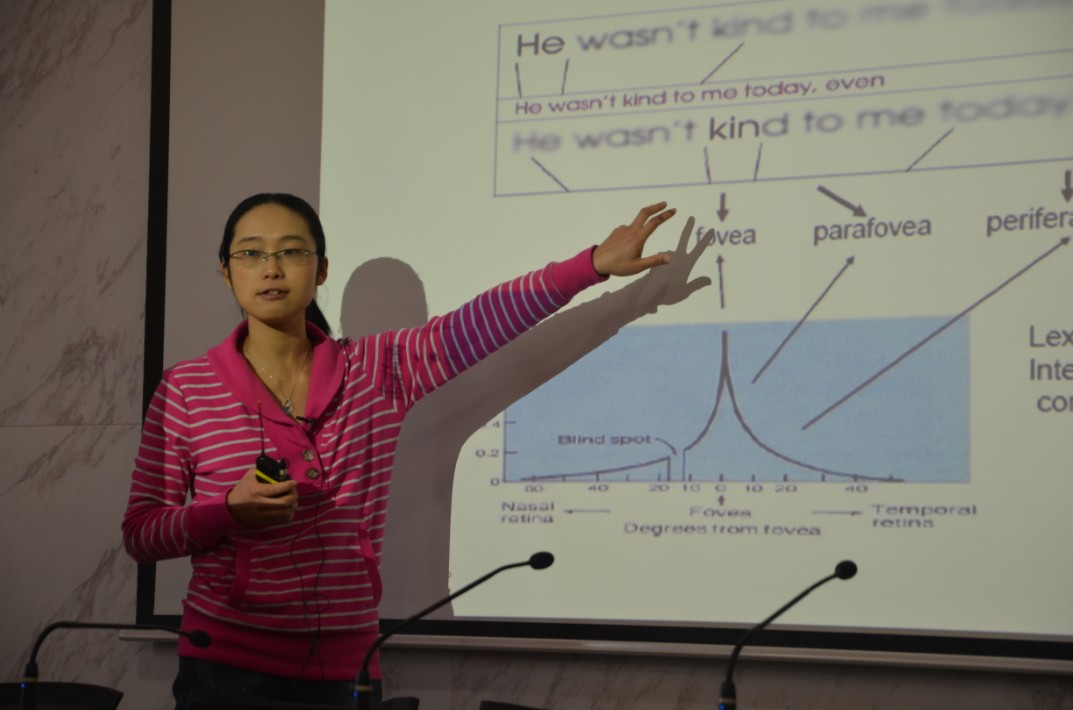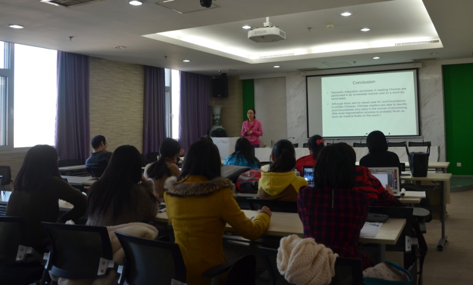2013年12月20日中午, 第十期“心引力”学术沙龙在新主楼1318室顺利举行。心理学院新进教师杨锦绵博士作客本次沙龙,以“中文阅读中的语义整合: 来自眼动的证据”为主题,分享了她近年来的研究成果,本次沙龙由李虹副教授主持。 首先,李虹副教授向大家介绍了杨锦绵老师的基本情况。杨老师为华南师范大学心理系硕士,美国麻州大学安城分校心理系博士,加州大学圣地亚哥分校心理系博士后。研究方向为阅读中的眼动效应,包括影响词汇识别的因素,中文的语义跟语法加工,中英文预视效应的机制,老年人、聋人、失语症病人的阅读行为研究,以及用ERP的方法检测眼动研究中发现的阅读效应等。在国内外学术期刊上发表论文二十余篇。 杨老师先从眼动仪的种类开始介绍,指出因眼动仪种类较多,需用眼动仪进行研究时,要结合研究课题的特点和被试的特点进行选择。在介绍了眼动仪的基本特点和原理之后,杨老师带领大家分析了中文字词相较于英文字词的不同,并介绍了一些国内已有的关于中文特性的研究。随后杨老师重点介绍了自己采用眼动方式进行的关于中文阅读中语义整合的研究,从中能够得出许多中文语义整合的特点,例如中文语义整合多以词为单位、虽无空格标记词的边界但不影响词语切割等。研究选题新颖、设计精巧,在眼动研究、语义整合研究方面给同学们开阔了视野、带来了很多启发。 在最后的互动环节中,同学们积极提问,有的同学更是基于自己的研究设计向杨老师请教,杨老师均一一耐心解答,并对同学们自主开展研究给予了很多的肯定和鼓励。