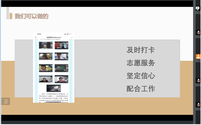 并且分享了他们的志愿者日常,以及如何用大数据进行防疫、保障志愿者的安全。 最后,徐星宇同学分享了他发放班级防疫物资、参加数科院防疫工作座谈会、担任学校核酸检测队伍疏导志愿者和返乡送站志愿者的经历。包括疫情防控中的两件温暖小事:女生自愿下楼等待领取口罩,减少工作人员等待时间,以及核酸志愿者过程中同学们自觉排队。