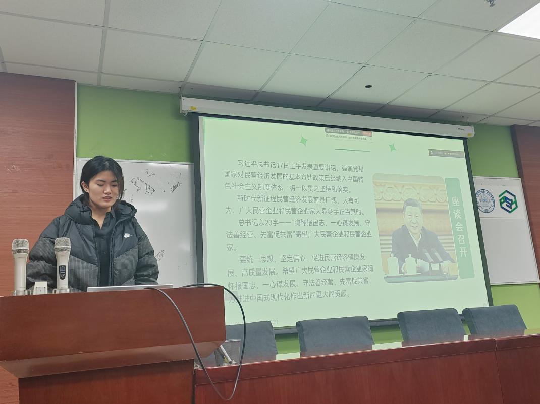 李思洁同志围绕习近平总书记出席的民营企业座谈会展开分享,重点解读“两个毫不动摇”方针的长期性,并结合地方扶持案例(如减税降费、优化营商环境)探讨政策落地对激发市场活力的作用。詹皓钧同志则聚焦“特朗普新政的政治逻辑”,从社会分化、经济民粹主义等角度解析美国政策动向,引导党员辩证思考中美关系发展趋势。