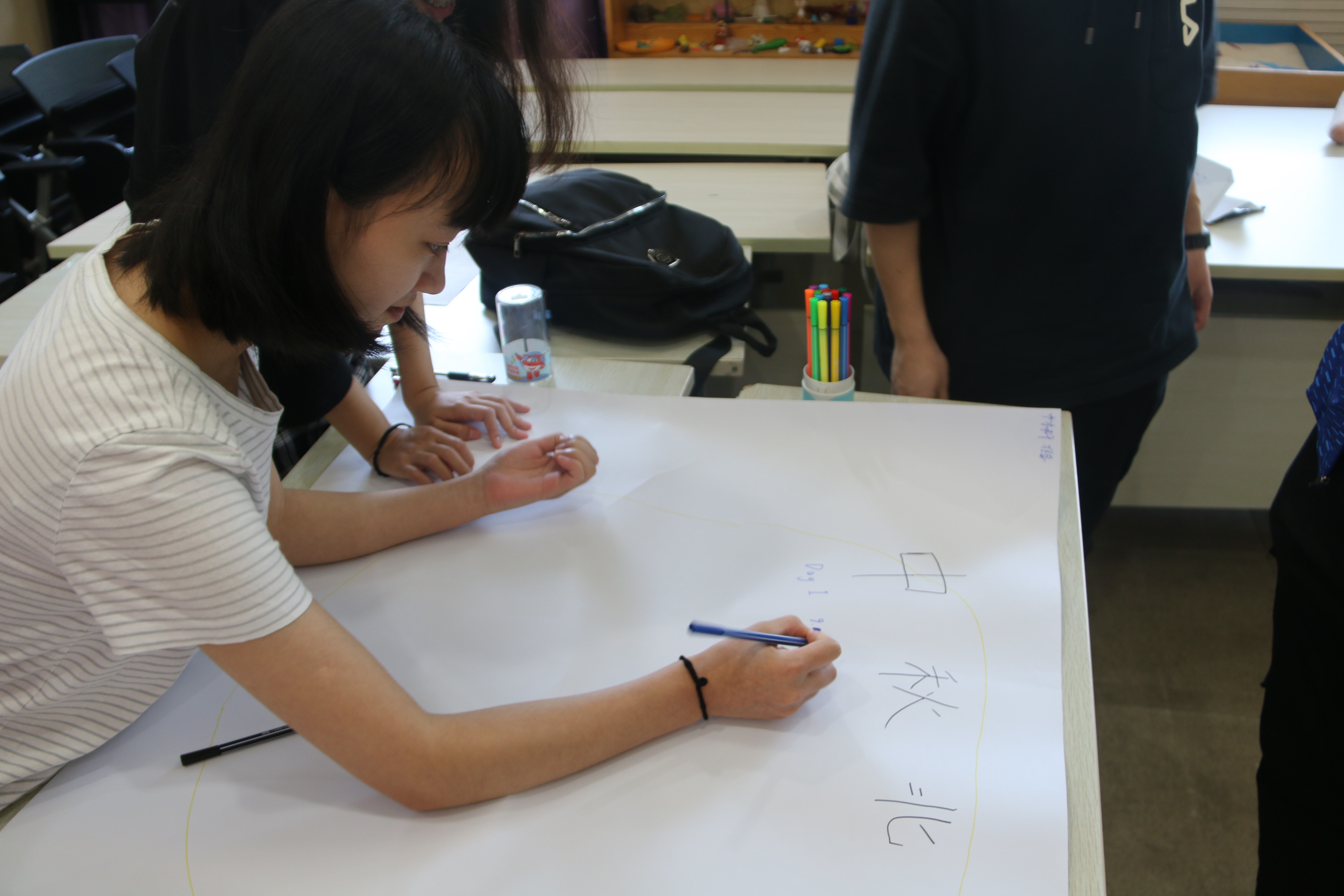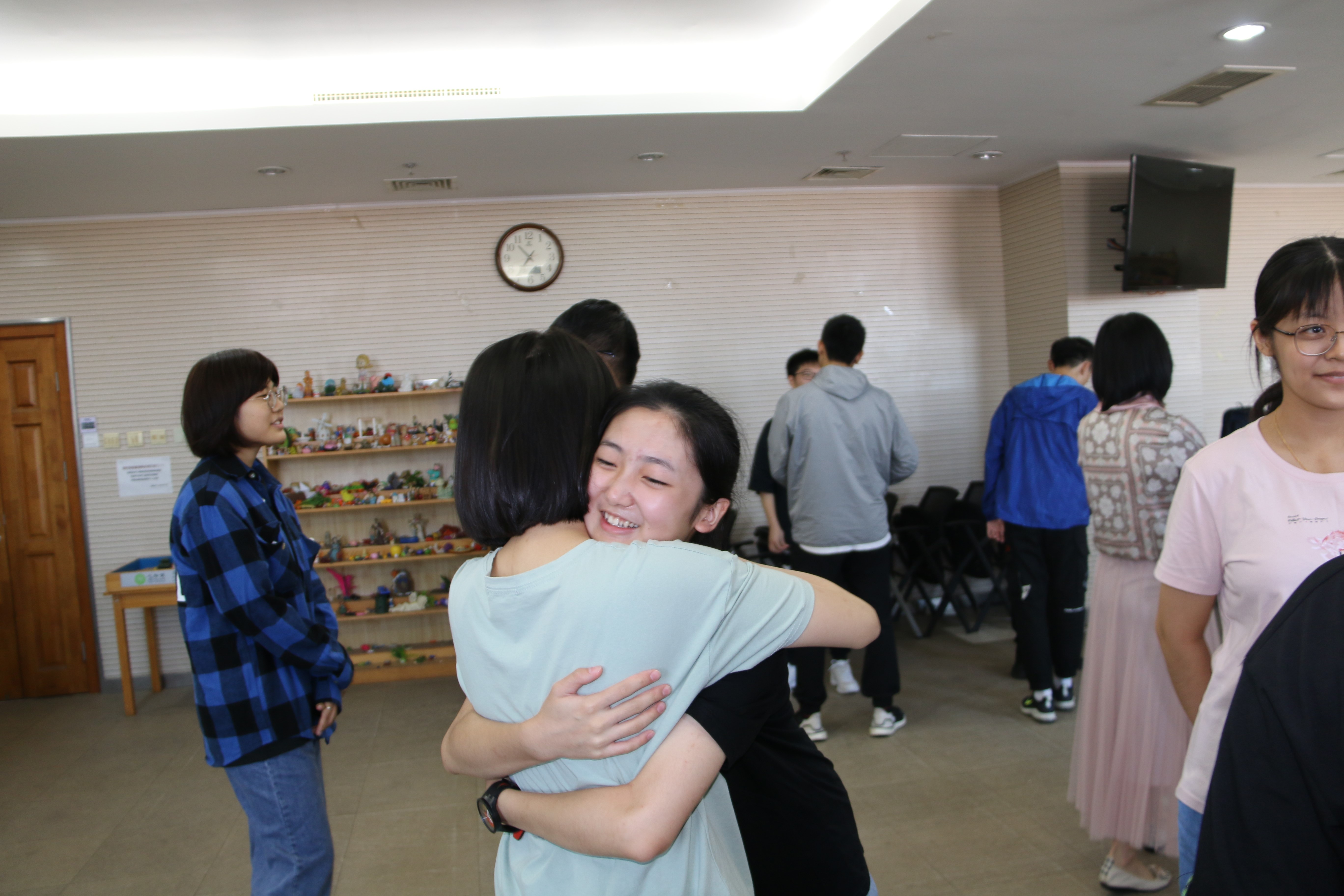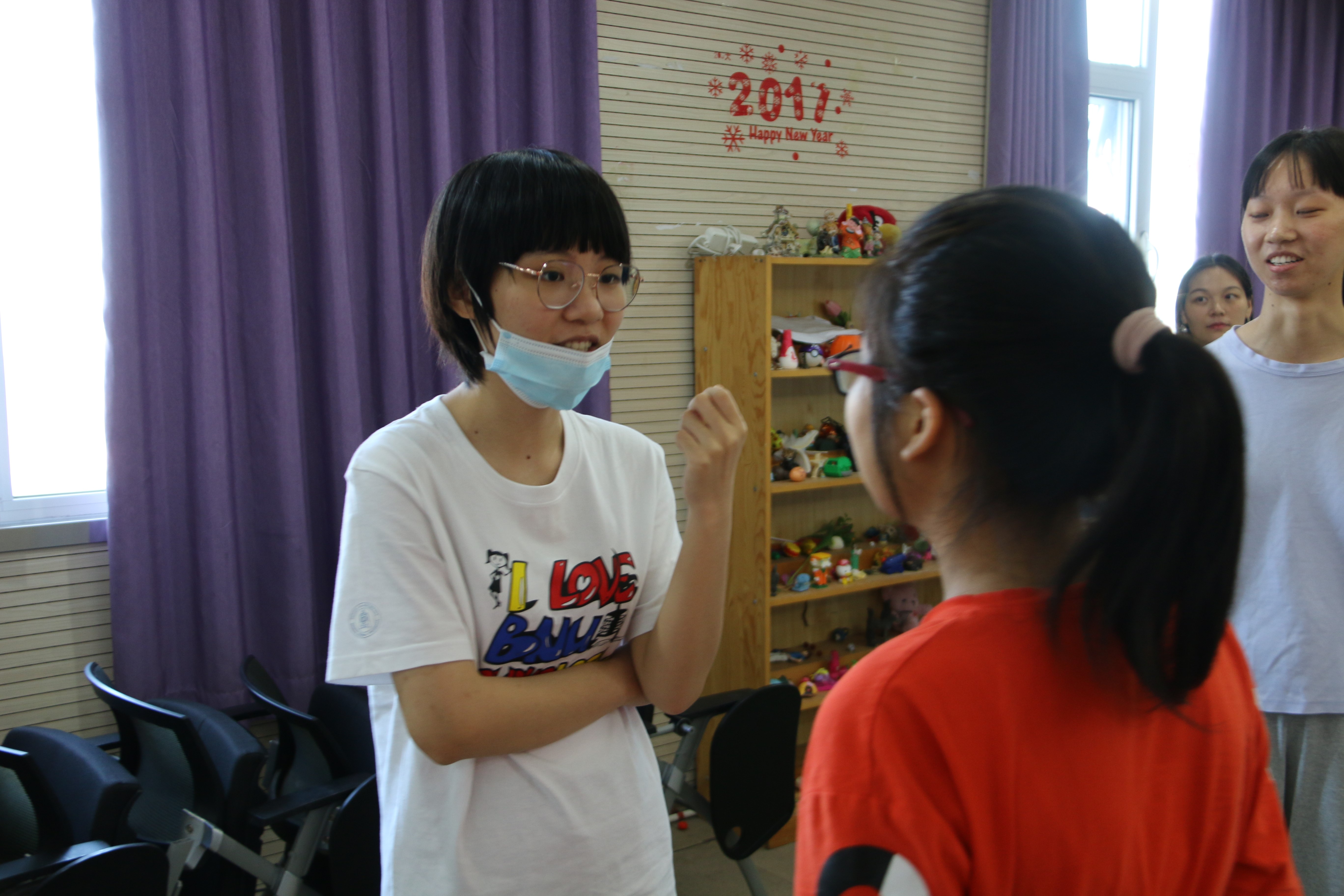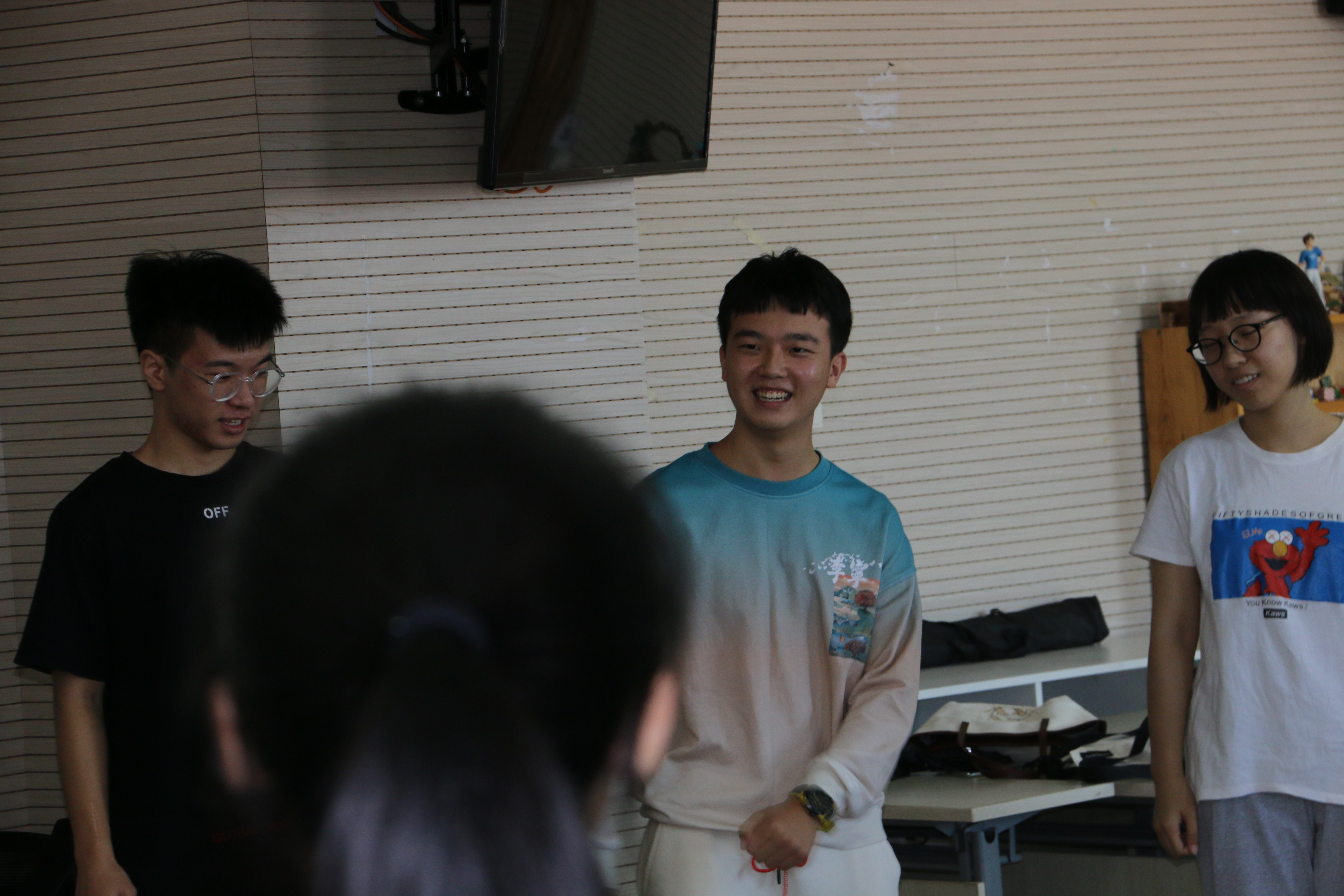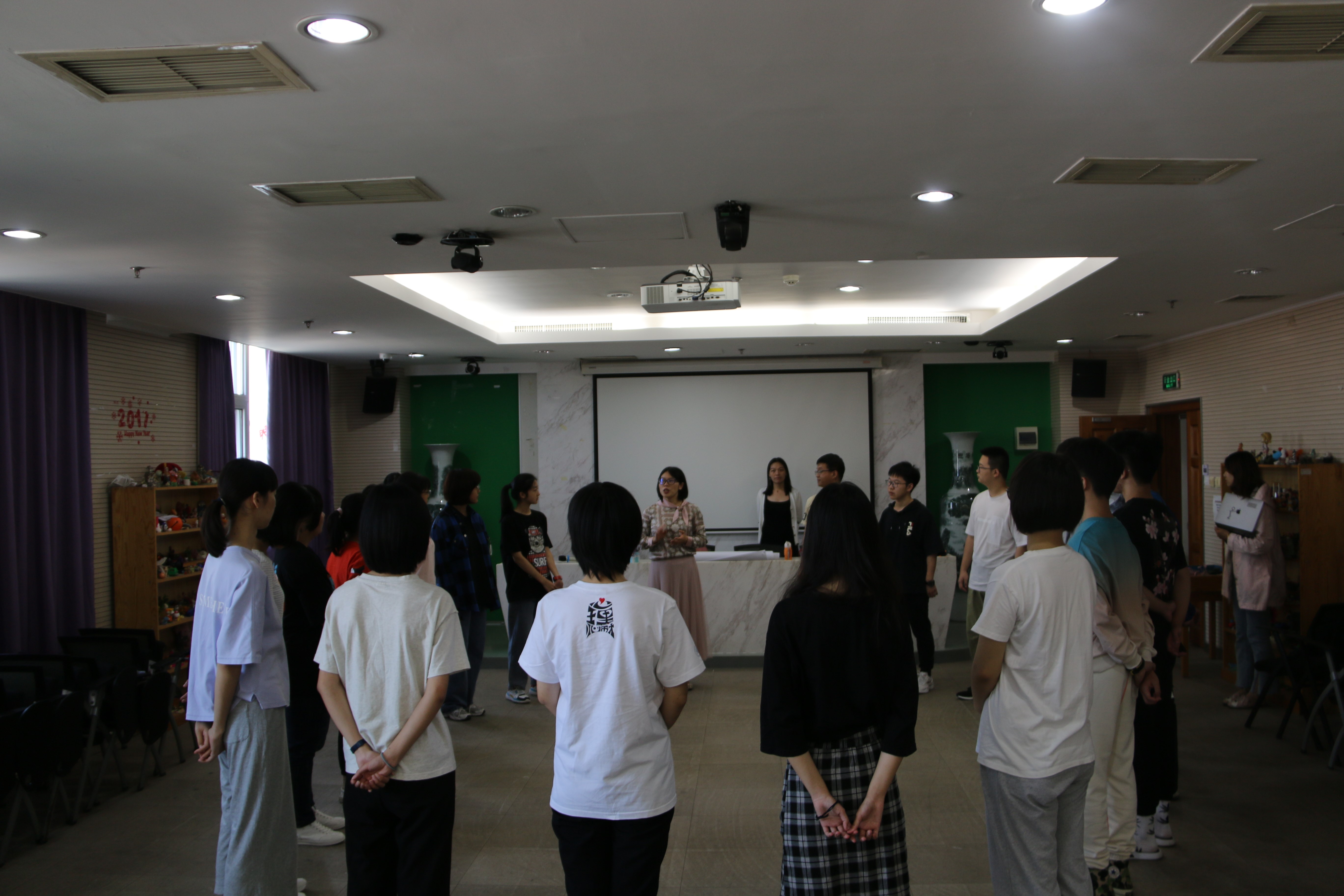 图1 黄利老师在讲解规则 首先是热身活动“我们是一起来的”,让大家迅速打开状态,打破尴尬。所有同学站成一个圈,然后逐个按照规则和人数举起双臂跳起来喊:我是X个人来的!依次为:我是一个人来的、两个、三个、四个,然后再从“一个”开始循环,直到无误完成回到起点即为成功。反应慢或者反应错过的同学要给大家带来礼物。一边大喊“我是明星”,一边绕场与所有人击掌庆祝。起初有些同学还放不开,但随着游戏的进行,大家也越来越投入,经历了几次cut后大家圆满完成任务,最后一起跳起来大喊“我们是一起来的”! 整个游戏中参与者需要集中精力去观察前面的同学,并在最后配合喊出“我们是一起来的”,这有助于同学们建立归属感。更重要的是老师引导大家将错误看待成“礼物”,这个新的视角告诉大家错误也是一次成长的机会,因此失误后的“惩罚”是与所有人击掌欢呼,这是教大家学会接纳自己的错误、接纳自己的不完美。 第二个活动是动作跟随自我介绍,同学们重复三遍自己的名字:“我是XXX”,并设计三个小动作,其余同学重复他的话并模仿动作。活动结束后有三分之二的同学认识了三个以上之前不认识的同学,促进了新同学之间的彼此认识。 图2 同学们在模仿其中一位同学的动作 图3 同学在自我介绍 第三个活动是幸福大转盘。大家按照1、2报数并分为两个小组,形成内外两个圈,两两形成搭档。在老师下达“123,出!”的口令后,选择自己感觉舒服和安全的方式和对方打招呼:用手指出示1/2/3/4,不同数字代表不同的打招呼方式(1-4分别代表微笑、握手、拥抱和抱起来转一圈四个打招呼方式)取数字低的一方完成。打招呼后有共计30秒双方进行自我介绍,内容不限。 在每一组互相介绍完之后,有老师下达命令,外圈的同学向某个方向移动若干个位置,在认识了一些新同学之后,老师还精心策划了“重逢”的场景——向反方向移动相同的位置,重逢曾经的搭档,再打一次招呼。结束后出的数字小同学分享说,会觉得是不是自己不够热情,出的数字大的同学说,会觉得是不是自己太热情了,下次出数字之前就会故意慢一些。这个活动让大家进一步地认识、了解了彼此,也让自己更多的觉察在人际沟通的开放度。 图4 同学在幸福大转盘中互相介绍 图5 同学在幸福大转盘中友好互动 接下来大家搬椅子围成圈坐好,进行简单的正念冥想,随后用纸笔画出自画像,并用三个词描述。然后大家依次报数“我”、“爱”、“心”、“理”,分为四组,组内同学每人一分钟的时间来介绍自画像。A同学画了四团“气泡”代表在座的四组,表示自己比较平静、追求价值、追求意义。B同学画了“站在悬崖上”,认为自己向往自由,经常处于顾虑之中。 图6 同学在画自画像