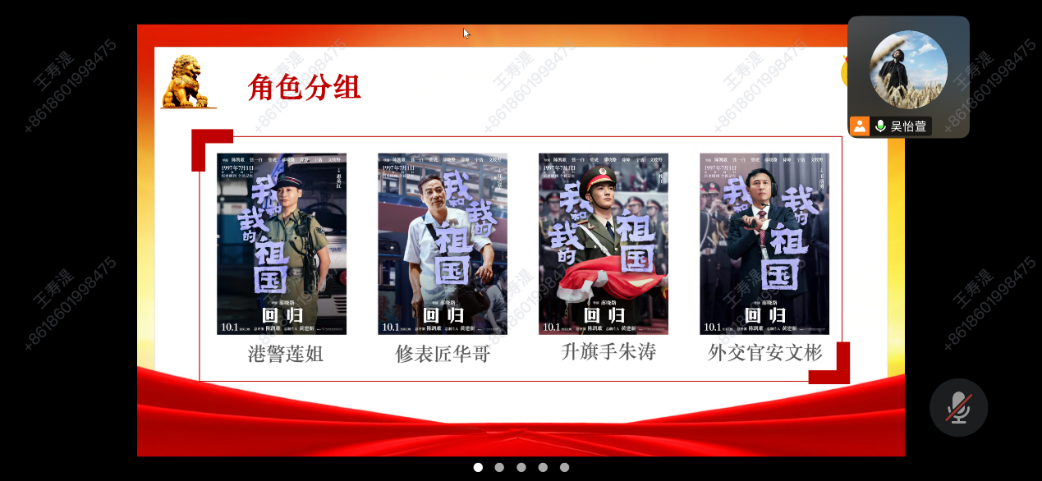 活动伊始,团支书吴怡萱同志对本次活动的内容及目的进行了简要介绍,强调了香港回归对于我国的重要意义。正式观影开始前,参会同志随机分入四个角色组——修表匠华哥、港警莲姐、升旗手朱涛、外交官安文彬。同志们将带入自身所分到的角色,沉浸式观看《回归》片段,重温1997年香港主权交接仪式中“分秒必争”的历史细节。