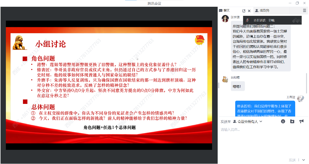 影片结束后,各小组在腾讯会议分组讨论室中,针对角色问题与总体问题展开热烈研讨。讨论结束后,各组分别选出一位同志作为代表,分享小组感悟。 在角色问题环节,港警组通过警徽更换的细节感悟主权移交的深刻内涵,修表匠组从“校准时间”解读普通人参与国家大事的责任感,护旗手组探讨朱涛极致训练体现的爱国意志,外交官组剖析“分秒之争”背后的主权象征意义。总体问题讨论中,同志们结合影片内容,从个人使命与民族情感的角度,深入解读“154年的等待”承载的历史厚重感,分享坚守主权的决心对当下奋斗的启示,以及述说香港街头降下英国国旗时中华儿女盼望国土完整的共同心声。经过全体参会同志的评选,外交官组和护旗手组的团员以深刻见解与生动表述获得最高票数,获得了本次活动的纪念奖品。