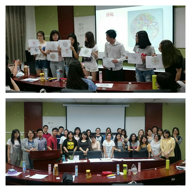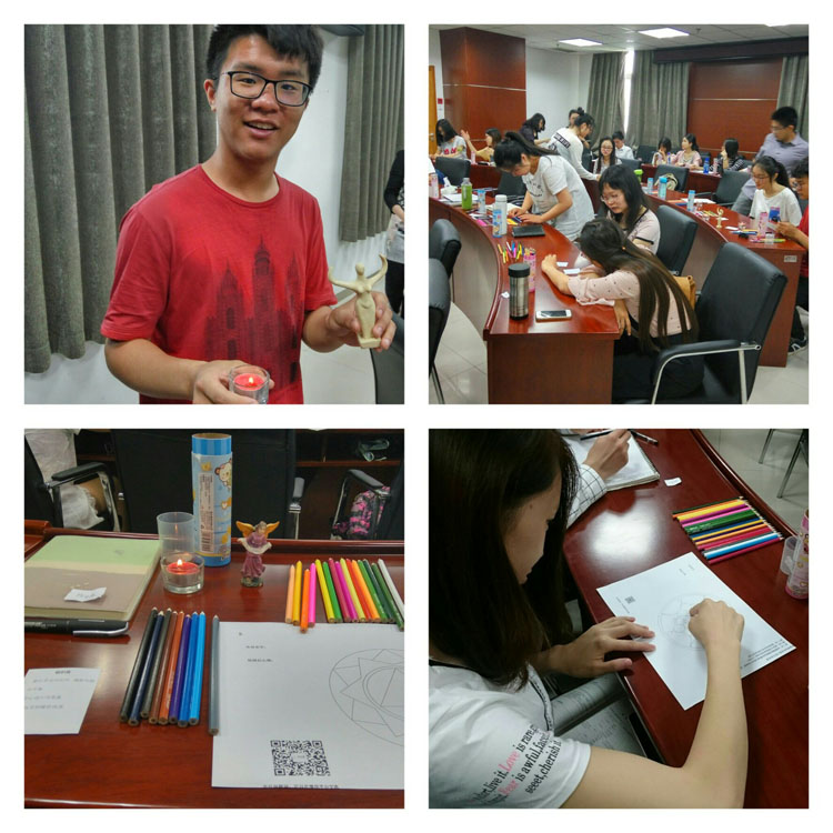 在体验环节中,同学们按照各自指示语的要求领取了小蜡烛和神像,在指导老师带领下进行冥想,并在随后的绘制曼陀罗图案中同学们专心参与、完全沉浸于内心世界。