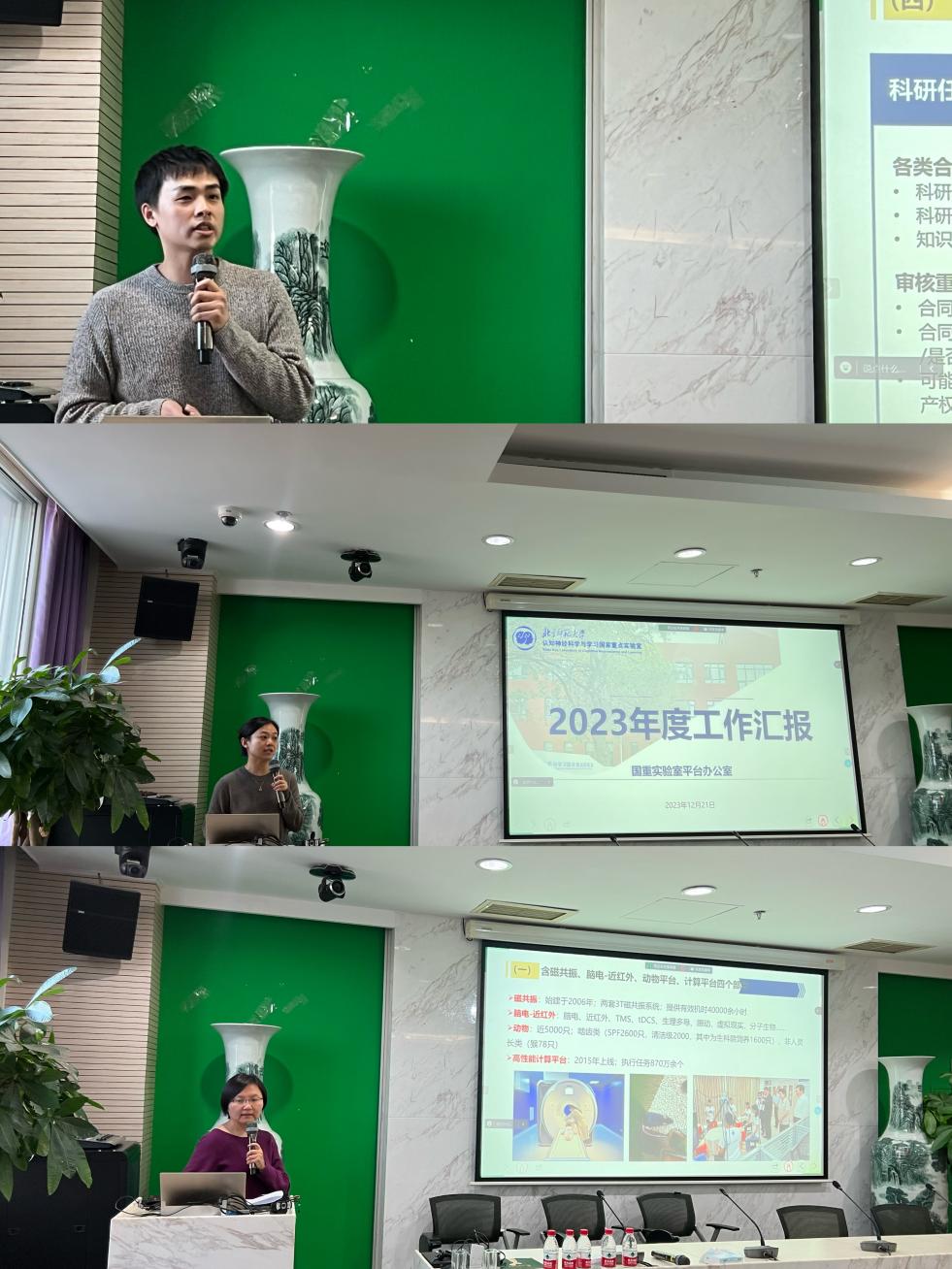 认知神经科学与学习国家重点实验室科研办公室樊攀老师、平台综合邓小湘老师、实验平台黄宇霞老师分别对认知神经科学与学习国家重点实验室的科研工作、实验平台工作及2024年的主要工作计划进行了述职汇报。
