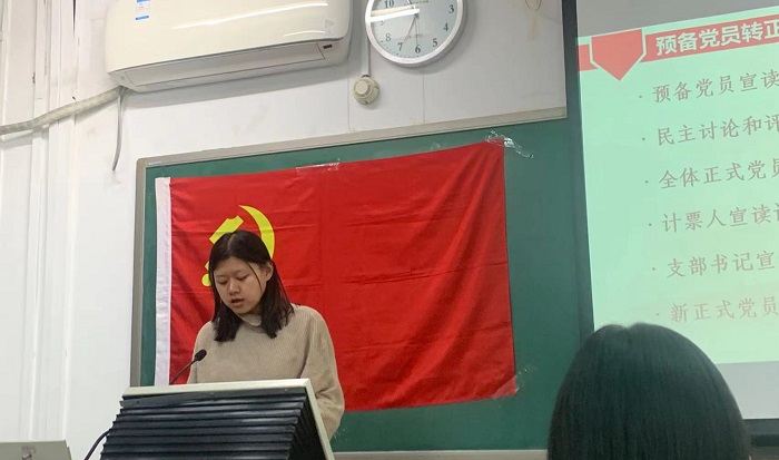 大会第三项,党内其他同志对三位预备党员的表现进行了评价,一方面对她们的表现给予了充分的肯定,希望她们继续保持优点,另一方面也向她们提出了有针对性的意见和建议。 大会第四项,在场的正式党员对三位预备党员的转正工作进行了无记名投票,并全票通过,支部书记宣读《党支部会议决议》。 最后,新正式党员发表入党感言,表达了对支部信任的感激之情以及日后继续努力的决心。 在转正大会结束后,纪检委员单旭鑫同志向参会的各位同志介绍了新的党员学时认定办法,鼓励党员积极参加支部内与校内活动,通过丰富的理论和实践活动进行学习和思想上的提升。