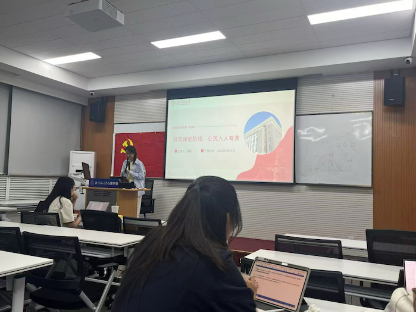 会议第三部分围绕“学生党员如何落实保密责任”展开深入探讨,内容涵盖思想先行、行动落地和先锋引领三方面。杨媛同志结合自身学习科研和日常生活场景,剖析保密风险点,提出了诸如规范使用信息工具、慎重处理涉密材料、主动宣传保密意识等切实可行的对策建议。 在警示教育环节,会议精选了多起高校及青年群体相关的典型案例,包括“使用微信办公导致涉密文件外泄”“留学生因随手拍照违反保密规定被追责”“旧手机未清除数据引发信息泄露”等,通过具体情节、法律后果和反思分析,使全体党员受到了强烈触动与深刻警醒。 会议最后,参会同志共同观看了保密主题纪录片,进一步增强了对保密工作系统性、战略性、长期性的认识。