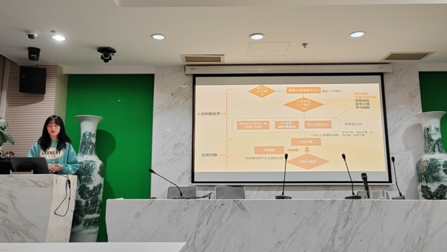 随后,本科生第二党支部组织委员唐凤华同志对“入党流程”进行了详细介绍。入党流程中的每一步都是对支部内积极分子们思想觉悟和行动能力的考验,也是他们努力向党组织靠拢的过程。