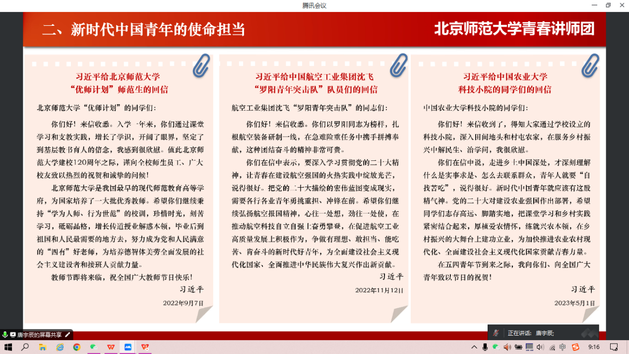 本次活动中,北京师范大学青春讲师团的同学唐宇辰为同学们进行了精彩的宣讲。 宣讲人以习近平总书记致信全国优秀教师代表的重要指示精神为引导,深入浅出地解读了指示中的核心内容,使同学们更加深入地理解了指示的精神内涵。他强调,作为新时代的青年,我们应该积极响应习近平总书记的号召,以实际行动践行“凝聚奋进力量,书写青春篇章,在中国式现代化建设中挺膺担当”的主题。