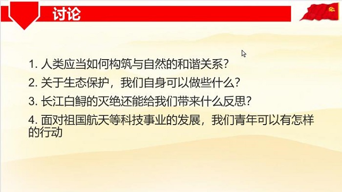 长江白鲟灭绝原因据悉有可能是因为其为生命周期长、生活空间跨度大、生态可塑性小的洄游生物,产卵条件较为苛刻。自1991年以后,都没有再发现白鲟的自然繁殖。2003年,白鲟最后一次出现在长江宜宾南溪江段。实际上,有研究团队认为,白鲟很可能在2005-2010年间就已灭绝,且早在1993年就可能已功能性灭绝,即虽然还存在野外种群,但其已无法进行自然繁殖活动。对此,我们更应该思考人与自然如何和谐共生,守护所有生物共同的家园。 第二组同学就南京玄奘寺供奉日本战犯牌位以及相关的“夏日祭”举办事件进行分享。7月24日,南京深夜通报,在南京玄奘寺供奉侵华日军战犯牌位的吴啊萍因涉嫌犯寻衅滋事罪,已被公安机关刑事拘留。网络上关于在南京举办日本传统节日的行为也是恶评如潮,文化交流是好事,但是对于历史的教训,当代人绝对不能遗忘,更加不能允许类似这样挑战民族底线的行为再次出现。