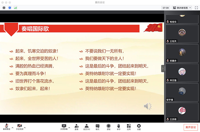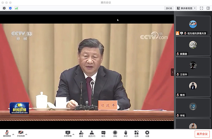 最后,程先楷同志鼓励各位同志围绕刚才学习的讲话内容对以上问题进行讨论,发表学习体会。同志们在聊天区踊跃发言:郑藕杏同志从精神建设、博物馆建设、师资建设、数字化建设四个方面分析如何“走出一条建设中国特色、世界一流大学的新路”;马新超同志提议应该从教师的考评制度方面着手,通过提高待遇和完善绩效指标来“培养出教学生为学、为事、为人的、被社会尊重的楷模,为世人效法的榜样的教师队伍”;李铭同志认为“坚持党的领导是共青团的立身之本”的原因是中国共产党让共青团理清楚“往哪走”,“干什么”,和 “怎么干”的问题……在同志们的讨论中,本次会议圆满结束。