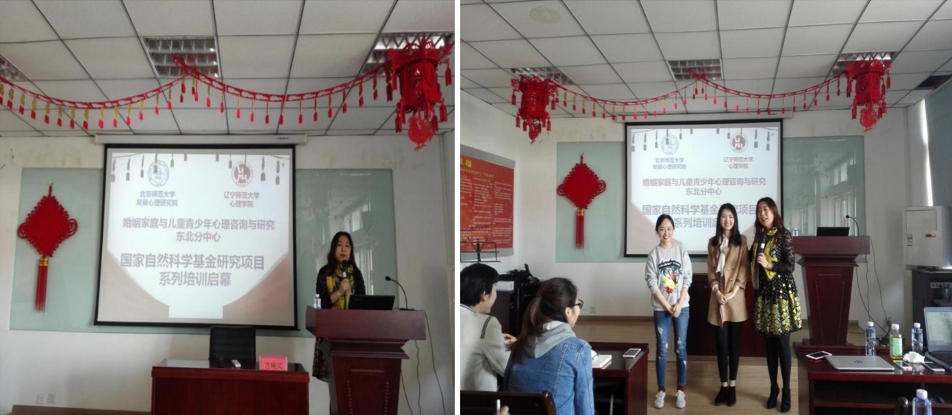报告现场 4月28日上午,刚成立的东北分中心就开展了第一项工作,由方晓义教授的两名博士生贺琼和童薇进行了国家自然科学基金资助项目“夫妻互动行为模式与婚姻质量:行为与认知神经机制”的培训。辽宁师范大学心理学院副院长刘文教授、副院长蒋重清教授、应用心理学系主任李灵副教授等老师和学生参加了培训。培训内容包括:1、项目缘起;2、问卷调查与实施;3、录像观察与实施。该项目将在大连地区选取六个婚龄段的夫妻开展问卷调查和录像观察研究,以探讨东北地区与我国其他地区夫妻互动行为和模式的异同,以及这些异同与婚姻质量的关系,建立东北地区夫妻婚姻质量的影响机制模型。 李灵老师、贺琼、童薇博士培训现场 双方将以此次东北分中心的成立为契机,加强合作与交流,共同推动婚姻家庭与儿童青少年咨询与研究在东北地区的发展。