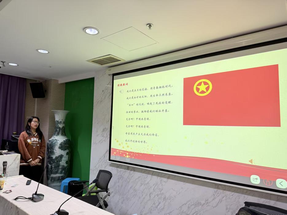 慰问环节结束后,活动进入庄严的奏唱仪式。在团支书吴玮婧同学的主持下,全体团员肃立齐唱《中国共青团团歌》。铿锵有力的歌声回荡在整个教室,展现了新时代共青团员昂扬向上的精神风貌,进一步增强了支部的凝聚力与向心力。团员在旋律中重温入团初心、坚定理想信念,深化了对共青团光辉历程与时代使命的认同,也为后续的主题学习营造了庄重而富有感染力的氛围。