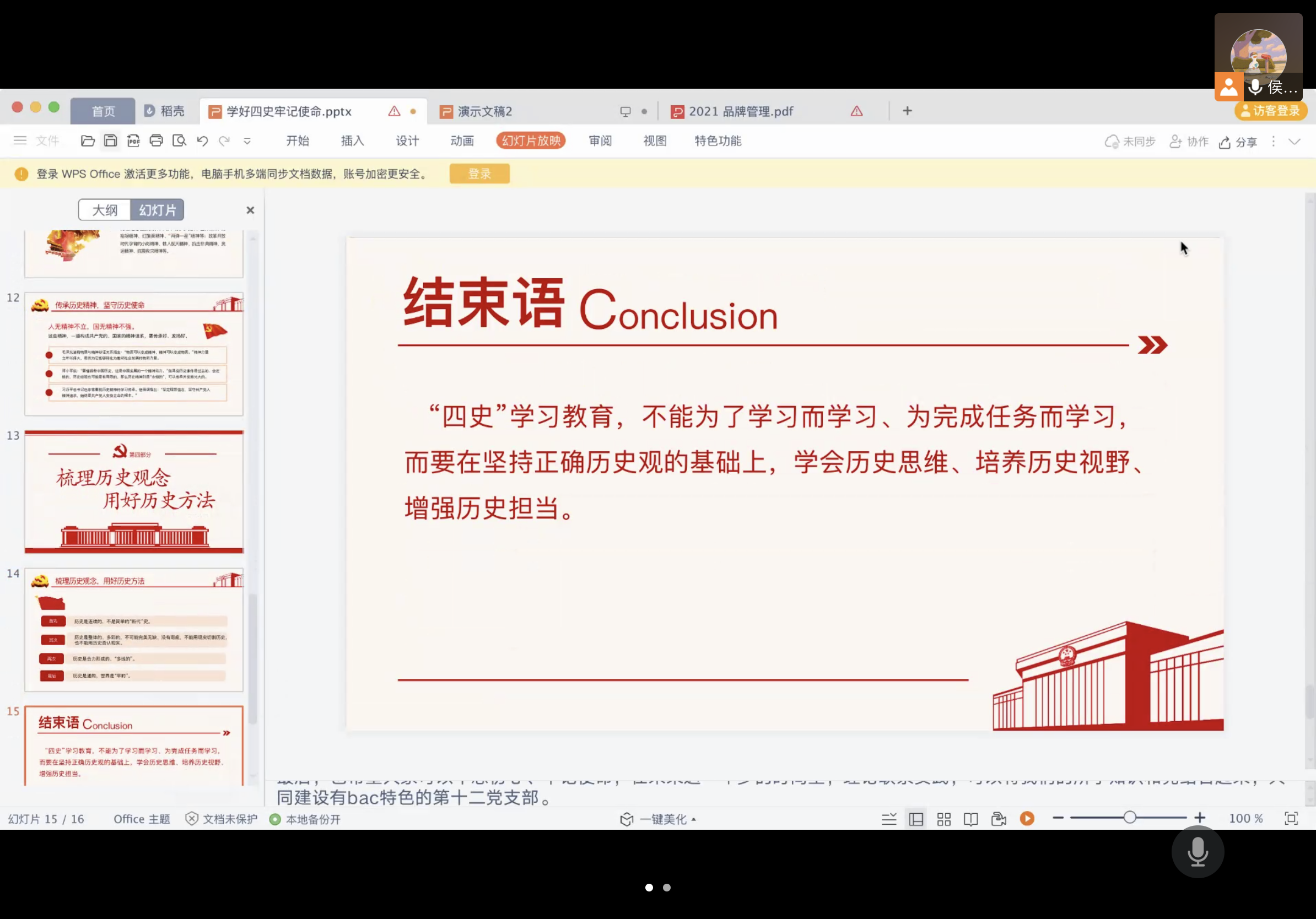 2021年2月28日晚19:00,欧洲杯 研究生第十二党支部于腾讯会议开展了本年度第一次支部主题党会。会议由支部书记侯雅莉同志主持。 本次主题党会的会议主题是:学好“四史”,牢记初心使命。四史对于党员来说,具有重要的意义。学好党史、新中国史、改革开放史、社会主义发展史,要从历史知识、历史经验、历史精神、历史方法这四个方面入手,依次递进,掌握重点,把握方法。 (一)学好历史知识,形成历史认知 (二)吸取历史经验,把握历史大势 (三)传承历史精神,坚守历史使命 (四)梳理历史观念,用好历史方法 在侯雅莉同志依次讲解完“四史”的四个方面后,与会同学根据自己的理解,发表了自己的看法,进行了交流。“四史”学习既是必修课,也是一项要长期进行下去的学习。我们要不断在“四史”学习中学会历史思维,培养历史视野,增强历史担当。