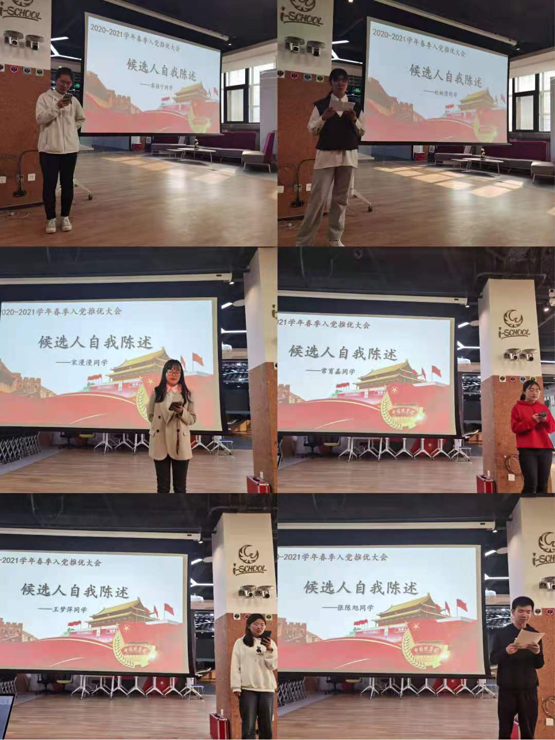 | 2021年4月6日15:30,欧洲杯 2020级本科第二团支部推优入党大会在金丰和路演厅顺利召开。会议由团支书段雨欣同学主持。 共青团作为党的助手和后备军,推优入党是团组织工作的重要组成部分,是协助党培养青年的重要方式。值此中国共产党成立100周年之际,我团支部团员表现出了积极的入党意愿,我支部十分重视本次推优大会,班团干部做好严密的安排,经团员报名和推优条件审核,共确定6名团员为本次推优大会候选人。   会议由激情而富有青春活力的团歌开始,接着团支书向全体团员介绍了候选人并强调了推优工作的严肃性和重要性,要求团员们在充分评议后,按照推优入党评分细则本着公平、公正、公开的原则为候选人打分,严禁弄虚作假。   随后,六名候选人依次向大会陈述了思想、学习、工作和生活等各方面的情况,对入党动机问题进行了详细地阐述。客观、公正、明确地指出自己的优点进步以及缺点与不足。   候选人均陈述完毕后,全体参会团员对他们进行了打分和询问。   经统计,本次会议应到54人,实到45人,出席人数符合规定人数;打分0人弃权,共收到有效评分45份。经过评分统计,根据《欧洲杯 推优入党工作办法》(分数高于85分者获推优入党资格),欧洲杯 2020级第二团支部决定窦佳宁、赵婉滢、宋漫漫、张陈旭、王梦萍和常育嘉6人为我团支部推优入党对象并报上级审批。 最后,团支书宣布大会圆满结束。会后,入选人合影留念。   通过本次推优大会,支部又有六名团员向党组织靠拢,并充分激发了团员的入党积极性和爱国热情。我支部将继续做好党的助手和后备军,以优异成绩为建党一百周年献礼。