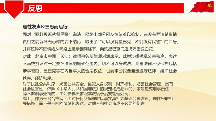 随后,沙卓异和黄彤彤两位同学分别对于b站员工新年期间加班猝死事件,以及民众为吃盒饭被驱赶的民警鸣不平而在重庆星巴克门口放置白花的事件进行展开介绍与思考讨论。在当代社会,公民应以合法的方式维护以及行使自身权益。对于加班,近年来社会竞争越来越大是无可避免的趋势,但无论如何也要对自己的健康负责,不能过于拼命。而对于伸张正义,则要适度,不能给境外策反西方资本进入中国市场的势力以可乘之机。