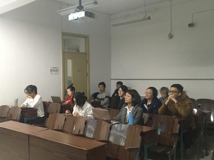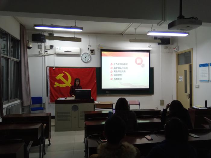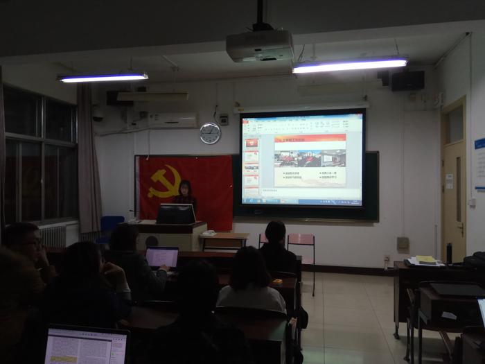 图1 支部书记胡潼介绍会议内容 随后支部党员同志共同观看学习了习总书记在十九届中共中央政治局常委同中外记者见面会上发表的讲话,以及十八大以来的建设成就短片和部分代表访谈的视频。通过视频学习帮助全体党员回顾我党取得的重大成就,了解时事动态,并且敦促全体党员不忘初心,牢记使命,继续为实现中华民族伟大复兴的中国梦不懈奋斗,从多方面温习和继续深入学习十九大精神。
