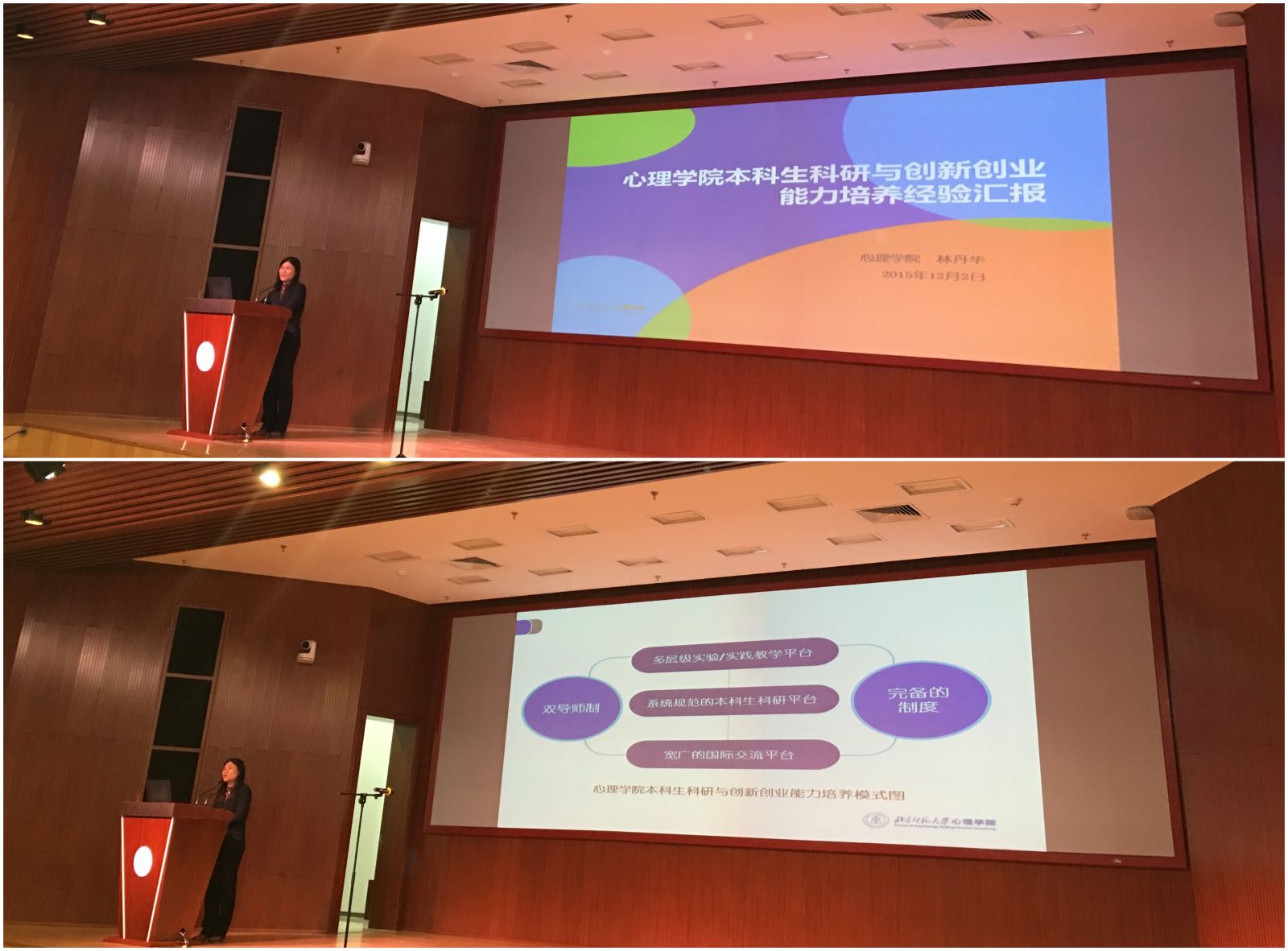 2015年12月2日,我院主管教学的林丹华副院长代表心理学院参加“北京师范大学2015年大学生创新创业论坛”,并在会上做了以“心理学院本科生科研与创新创业能力培养经验汇报”为题的发言。本次论坛由北京师范大学心理学院教务处主办,教务处副处长李艳玲主持,北京师范大学副校长史培军、教育欧洲杯课程与教学院副院长胡定容等10名各院主管教学的领导及200余名同学参加了此次论坛。 我院副院长林丹华老师作为论坛首位发言的嘉宾,从我院心理学学科人才培养的目标出发,向在座的老师及同学汇报了心理学院本科生科研与创新创业能力培养的实际经验。汇报具体谈了我院多层级实验、实践教学平台,系统规范的本科生科研平台,宽广的国际交流平台等培养措施,并将双导师制、完备的制度保障向大家进行了分享,赢得了现场观众热烈的掌声。史培军副校长在论坛现场的发言中对我院的本科生科研与创新创业能力培养的管理经验给予了肯定,并说“这些管理经验令人感动”。 我院本科生科研训练与创新创业项目管理已进入规范管理阶段,本科教学改革力求以“本科生科研项目”为点,以点带面,逐渐完成从对“教”的重视转向对“学”的关注,开启心理学院本科教育教学改革的新历程。