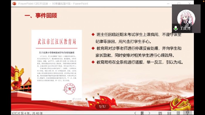 2021年1月31日晚7点,欧洲杯 本科生党支部第二小组通过 “腾讯会议”平台在线上成功召开了2021年一月份的党小组会。会议由小组组长单旭鑫同志主持,共49名小组成员参与。本次的会议的主要内容为两个小组进行新闻时事播报,其余同志观看学习并讨论。 会议开始前,各位参会成员扫描二维码进行签到,然后主持人宣布会议正式开始,全体起立,奏唱《国际歌》。 之后,由两个小组分别开始了时事分享。第一个小组分享的主题是“疫情中的百态人生”。徐炜同学通过因公殉职的医生王烁、多天未能回家的民警牛磊磊、阻碍防疫的退休大爷和被网暴的成都女孩,生动地为大家展现了疫情中的百态人生,并以疫情所思作结:疫情是最好的教育课堂和社会课堂,需深刻反思抗疫中暴露的“人的问题”,要以爱国主义、媒介素养和批判性思维培养大写的大国公民。 第二小组分享了三个时事热点。 第一个是教育惩戒的问题,主讲人通过讲述武汉小学生被老师打手,教育局通报“停课,致歉”的例子提出自己对于教育惩戒的观点,并大致介绍了国家教育部出台的相关规定,提出了教育惩戒的边界。 第二个是美国国会山事件,通过对总统选举过程中出现的暴民侵入美国国会事件讨论了美国所谓的“自由平等”究竟是不是真正意义上的自由平等,并提出了真正的自由平等的理想形式,同时也客观地讲述了美国国情下存在的问题。 第三个时事热点是代孕的问题,主讲人介绍了最近微博等平台上网友对于代孕的看法,介绍了代孕的发展历程以及各国对于代孕的态度,提出了代孕是否应该合法化的思考与讨论,最后主讲人提出了自己的观点,说明了代孕存在的各种问题,并且呼吁大家一起讨论究竟怎样做才能打击代孕产业链。 随后,进入了讨论环节,大家积极地就刚刚分享的时事展开讨论。 陈晓曦同志就教师体罚事件提出自己的观点:教师惩戒的划分界限很不清晰,其实主要是看对孩子身心健康的影响是否严重、负面。适当的惩罚是对孩子有益并且有必要的,毕竟孩子的年龄还小,自律性比较差,有人监督是个好事,但是一定要注意尺度。老师在平时可以和学生像朋友一样相处,但该严格的时候也一定要严格。 李翊赫同志就美国国会山沦陷事件提出观点:美国追求的自由、民主缺乏现实基础,因为没有完善的制度,美国很多底层人的权益并没有得到保障,从疫情救治到疫苗注射,很多贫苦国民生活都受到了严重威胁。另外,枪支问题在美国迟迟没有得到妥善解决,很多无辜人因枪击丧失生命,如果连国民生命安全都得不到保障,所谓自由和民主只是自我建构的空中楼阁罢了。 车俐颖同志就疫情期间成都确诊女孩被网暴事件提出观点:成都确诊女孩网暴事件所揭露的,不只是对新冠感染患者的污名化,将对病毒的对抗转移至同样无辜的受害者身上,其背后,更是一些人习惯于巧妙抓住舆论的风口,自以为是地站在道德的制高点去苛责他人,在攻击、诋毁、谩骂中获得自身的安宁,在良心上的对自己无所作为的愧疚情绪的抵消。疫情是一面镜,再次折射出人在无力感与恐慌之下的脆弱与不理智,如何规定法律,遵守道德,尊重他人,正化群众心理,为网络、为社会撑起一片晴天,是我们每一个平凡的人及社会规则的制定者应始终共同思考的问题。 其他参会同志也纷纷发表感想及思考。 在意犹未尽的讨论声中,本次党小组时事分享会圆满结束。会议结束后,主持人又在党小组微信群里发布了小程序,以便大家针对相关话题继续讨论和学习。 本科生党支部 供图:张冯铭依,刘一诺 供稿:刘一诺,张冯铭依,李春宇 |
