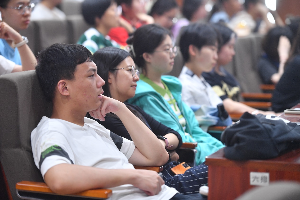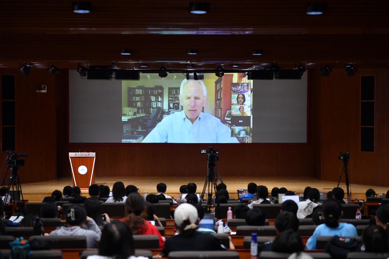 接下来,卡巴金教授讲述了自己学生时代的经历。卡巴金讲到自己的父亲是一位科学家,母亲是一位画家,卡巴金教授受父母的影响,对自然科学和人文科学都有浓厚的兴趣。后来,卡巴金教授进入大学后不仅学习了科学知识,而且还学习了英法比较文学,了解到了不同国家的文化。卡巴金教授通过自己的经历告诉同学们,要及时“为自己调音”,要想清楚“我们是谁”的问题。