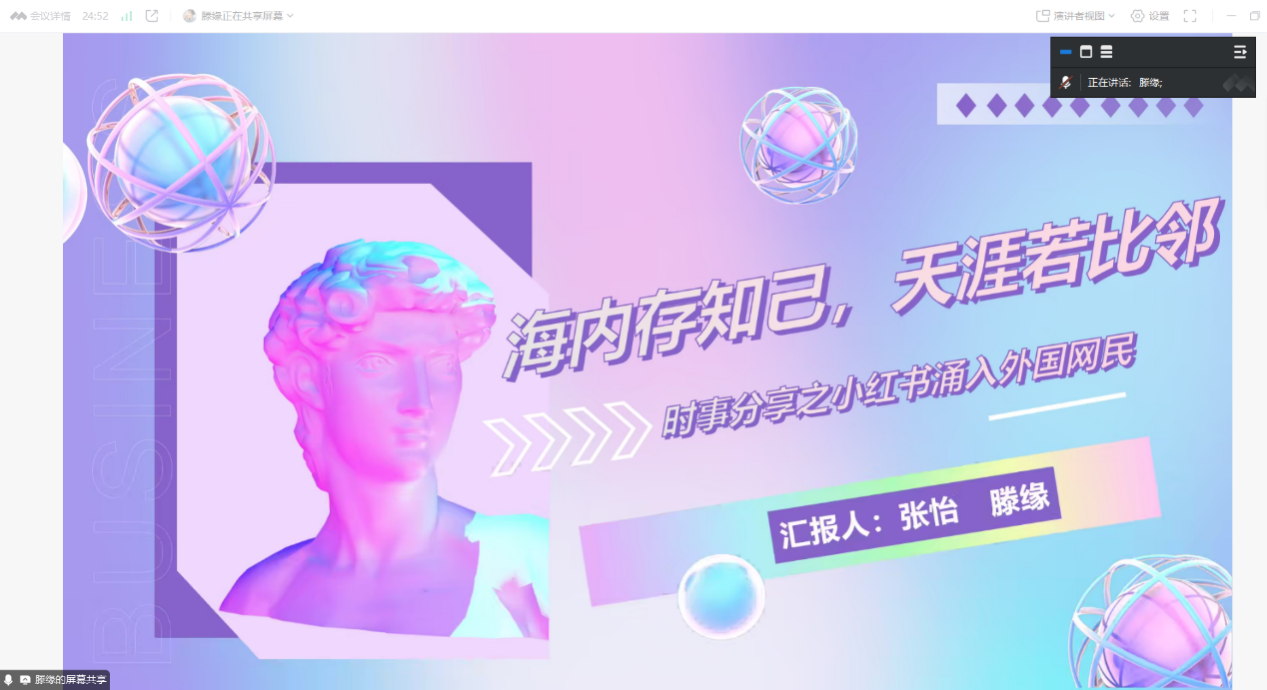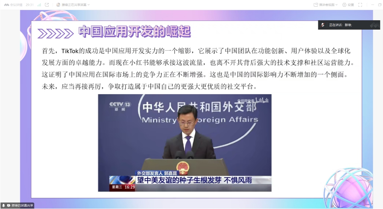 第二组作分享的是滕缘和张怡两位同志,题为《小红书涌入外国网民》。滕缘同志从Tik Tok(抖音国际版)在美国拜登政府的政令中屡屡受挫并面临停服的情况谈起,引出国内新兴社交媒体平台小红书是如何成功地在此次风口中成为弄潮儿。随后,滕缘以东西方文化交流、信息壁垒打破和国产应用软件崛起为角度展开,总结了这一时事。