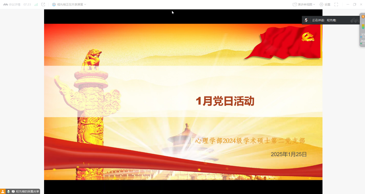 2025年1月25日晚6时,欧洲杯 2024级学术硕士第二党支部通过线上平台顺利开展本月主题党日活动。会议由党支部书记程先楷同志主持。支部9位正式党员和14位积极分子到场参会。
