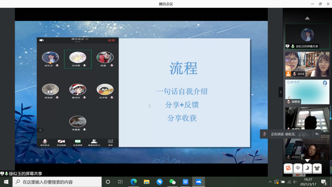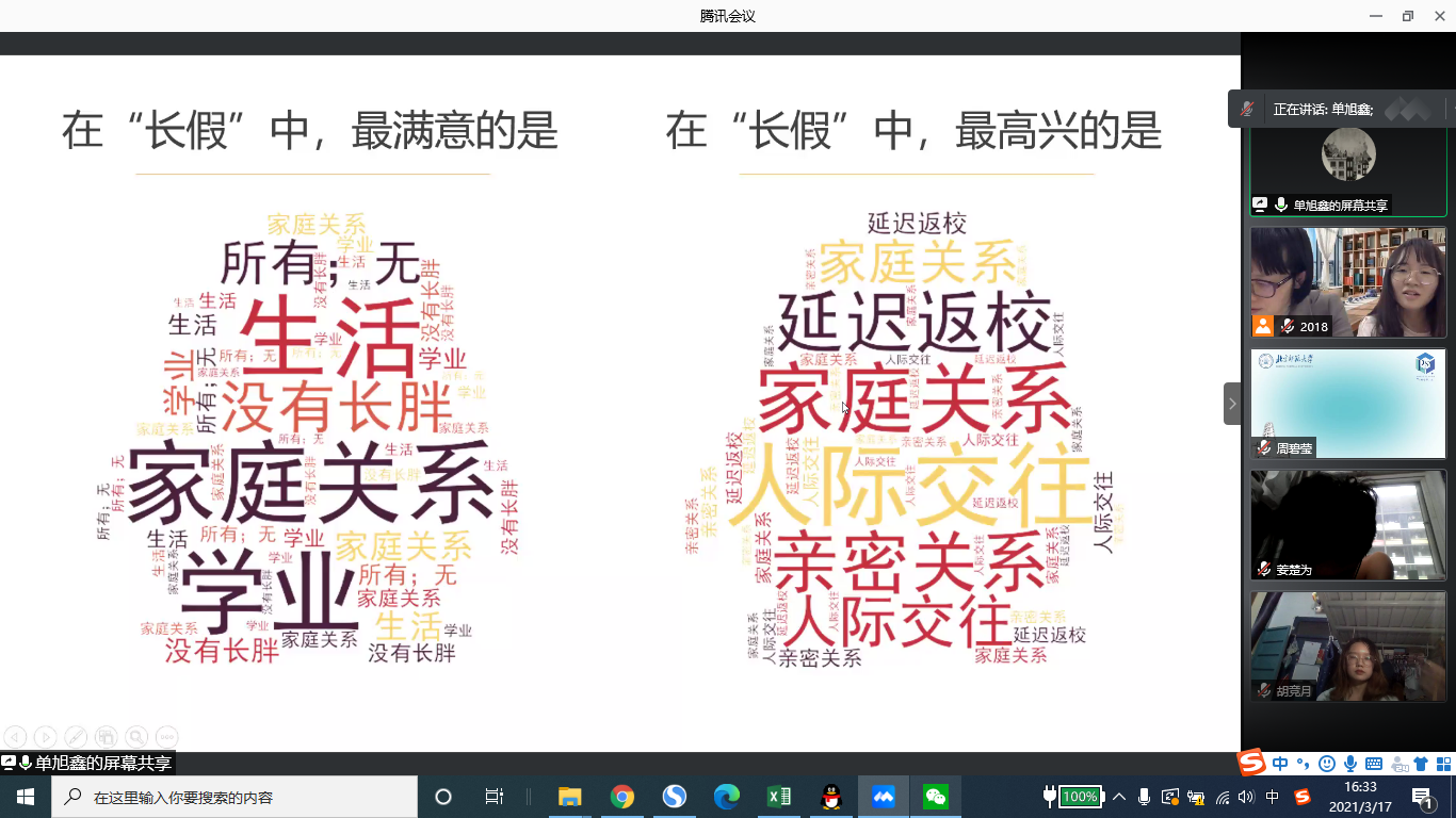 2021年3月17日下午2点半至4点半,欧洲杯 2018级本科生成功举办了线上年级大会。本次会议由2018级本科生辅导员黄利老师和周以铭老师主持,共114名学生参会。会议共包含两个议题:一、实习交流与分享;二、“好久不见,认识自己和更多的你”心理健康团辅。 在实习交流与分享环节,首先,由欧洲杯 党委副书记王瑞敏老师向大家介绍了欧洲杯 2020届本科毕业生未就业的情况和近几年的考研形势,王瑞敏老师告诫大家要主动把握自己的生涯发展,如果决定读研就要背水一战尽早开始准备,如果决定不读研那么这学期就要启动求职准备。 之后,具有丰富实习经验的2017级本科生车梦盈和正在实习的2018级本科生张琬琰向大家分享了自己的求职经验以及工作感悟等。两位同辈的分享详细且实用,令大家收获颇多。 接下来是“好久不见,认识自己和更多的你”心理健康团辅环节,分为前期准备和报告展示两个部分。 在年级大会前一天进行活动准备,欧洲杯 本科2018级全体140名同学,被随机分配到14个小组,组内选出一名组长,组织大家以小组的形式开展团辅练习和活动分享。团辅练习的内容主要包括大家对于过去假期的回顾和对于未来生活的展望,每个人认真完成后,由组长组织,在年级大会开始前,围绕团辅练习的内容进行小组内交流分享,并商议决定大会上的3分钟小组展示内容、形式等。 会议上,14个小组按照随机的顺序报告,组长们都用心地总结了大家小组分享的内容,很多组也专门制作了精美的ppt,为我们展现了大家丰富多彩的假期生活和有关新学期的形形色色的期待。从中,我们能看到同学之间很强的共性,但也能感受到强烈的个性,无论是客观生活上的不同,还是在写团辅练习时的唤起和关注点的不同,在听到大家的分享后也会再次引发我们的联想和思考。 小组分享结束后,有同学说道自己在听到大家的生活和期待后会产生一点焦虑,或许是因为有同学在自己有所遗憾的方面取得了好结果,或许是因为看到很多同学早早就有了规划和准备。面对这样的情绪,我们还是要找到自己的方向和节奏,可以预约黄利老师的“梨花奶茶”活动,为大家疏导情绪、排忧解难。 最后,全体同学进行了合影留念。让我们再说一句“好久不见”,祝愿大家都能在顺利和充实地度过新学期,破除迷惘,收获成果!本次年级大会圆满结束。 欧洲杯 本科2018级 供图供稿:黄小涵,熊心妍,李春宇 |