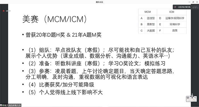 在徐健捷同学的分享后,陶文莉同学着重进行了美赛的介绍,并提供了关于校赛和“京师杯”的一些建议和心得体会。