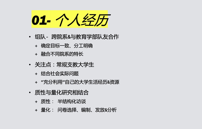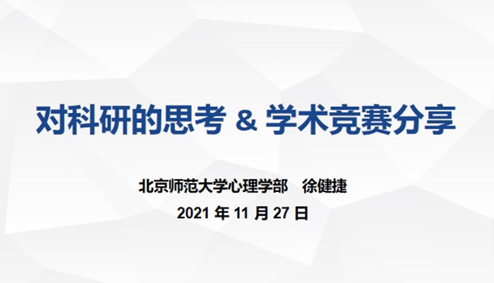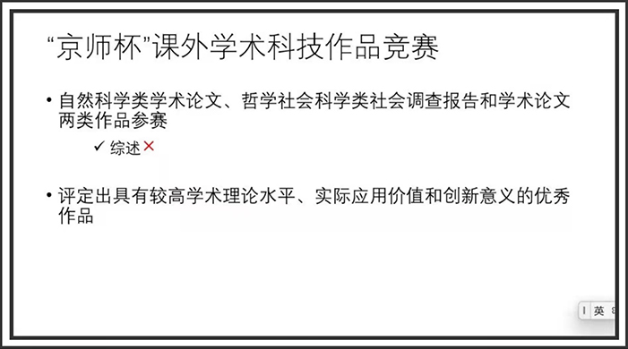 第三位分享的是张秀晴同学,她具体介绍了有关“京师杯”的选题、投稿和写作,并围绕选择队友和导师时的注意事项做出提醒。