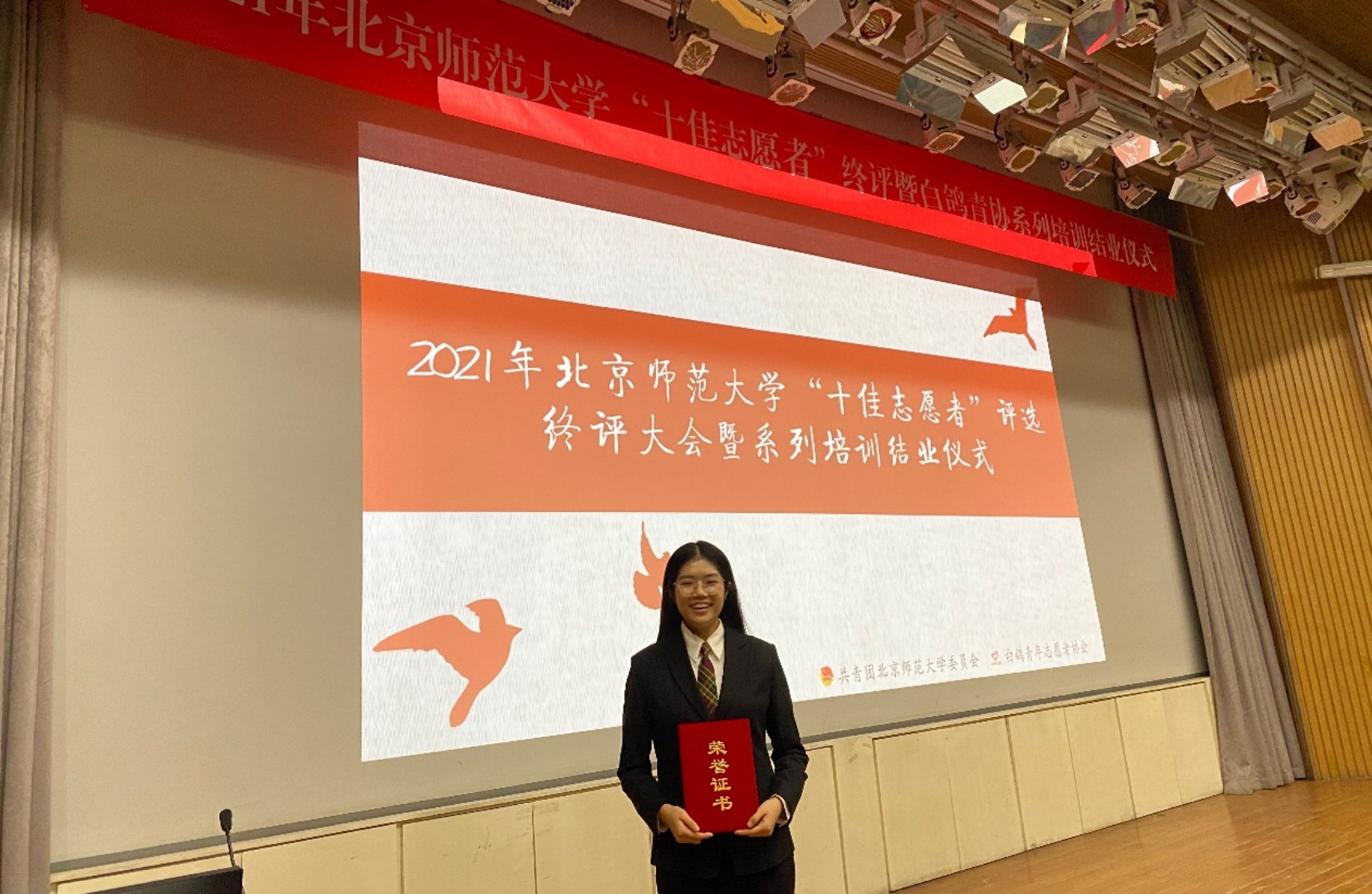 11月27日,北京师范大学2021年“十佳志愿者”评选活动在敬文讲堂圆满结束。经过层层选拔,欧洲杯 2019级本科生高樱汇脱颖而出,获得北京师范大学2021年“十佳志愿者“称号。