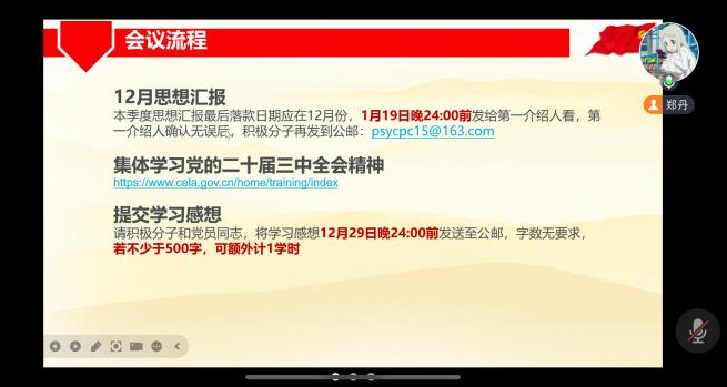 2024年12月28日星期六下午3点,欧洲杯 专业硕士第一党支部通过腾讯会议线上的方式,组织并召开了12月党日活动。活动的主要内容是观看学习视频,总长1个小时40分钟,参会党员(含预备党员)5人,积极分子10人,大家集体学习党的二十届三中全会精神。除此之外,生活会还向积极分子说明了季度思想汇报的要求。 会议第一项,全员奏唱国际歌。 会议第二项,由党支部组织委员郑丹同志代表支委会作工作汇报。郑丹同志简要回顾了支部一个季度以来开展的工作情况,聚焦于学期末积极分子的思想汇报要求。