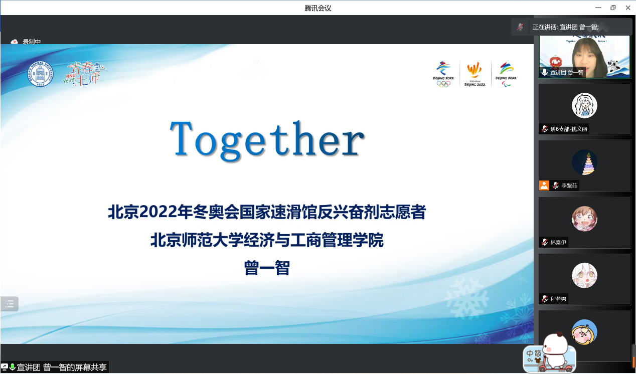 宣讲活动结束后,大家的热情不减,在群里分享了自己的感想。 周婧怡:宣讲团同学给我们介绍了很多幕后的故事,让我了解到了不同岗位精彩有趣的工作内容,也弥补了我没有能够亲身作为冬奥志愿者参与到这项盛事中的遗憾。在宣讲的过程中,我们看见了这次冬奥会与冬残奥会从宣传片、演出节目等的“软件”,到雪飞天、雪如意等“硬件措施”上处处体现了中国魅力、中国风采,处处彰显着文化自信。当然,我们的自信不仅仅来自于传统文化,从志愿者们的热情到运动员们的实力,从工作人员的专业与创意到体育场馆使用的高精尖技术,每一处都彰显着中国实力与中国自信。除了这些光鲜靓丽之外,我们也能看到各项活动、仪式圆满完成的背后,是工作人员们无数次演练、彩排、遇到突发状况的紧急处理,大家真的很不容易,都尽自己最大的努力,在自己的岗位上做到了最好。这些努力与奋斗,这些坚韧不拔、不到最后一刻绝不放弃的精神,才是中国自信最根本的来源。 张涵宇:今天的冬奥精神宣讲,几位同学从不同的方面向我们介绍了本届冬奥会和冬残奥会,不仅让我对于冬奥会的各类设置更加了解,还通过自身的工作、志愿服务经历的分享让我更加生动地看到北师大学子默默贡献的力量。尤其是开闭幕式的工作人员,明明是离演出最近的人,却因为忙于表演工作的筹备、组织等,而没有办法完整地看一次演出,这让我非常动容。是每一位完全地忘我、全然地奉献的幕后工作者,成就了这一次的冰雪盛会。 蒋欣颖:冬奥会宣讲团同学们今天给我们带来了很多冬奥会和残奥会的故事,将之前带了一层神秘面纱的志愿者工作栩栩如生地展现在我们面前,让我感受到其中的不易和勇往直前的精神,也感受到奥运精神的拼搏向上。在宣讲过程当中,从很多处的细节,都能感受到细节的作用,感受到对待每一个工作一丝不苟的精神。最令我印象深刻的是里面关于防疫的一句话,大概是对于个人而言,感染的风险可能增加;但是对于整个场馆感染的风险却是降低了。这种以众任为己任的精神,令人感动,也感到佩服。这种精神和信仰,值得我好好学习,好好提醒自己,在未来道路上,要有全局观,要有为他人分担,为社会贡献出自己力量的信念! 陈作为:为冬奥together的精神感到振奋,也为志愿者舍我其谁进入闭环而感动。听到志愿者和外国运动员、技术员的友好来往,听到外国人会跟我们的志愿者说出一句句不熟练的“谢谢”,让我又相信了人与人之间的美好了。冬奥会能办得这么顺利,这么成功,背后是无数志愿者无怨无悔的付出,为他们点赞! 刘津均:今天的宣讲有一些冬奥会的小知识和很多幕后工作人员的工作内容,让我们再一次回顾了简约、安全、精彩的奥运盛会。这精彩是我们的骄傲,其中必然离不开祖国的强大,也离不开广大青年同志的艰苦而又热情的工作。在这次的宣讲中最让我印象深刻的是我们的同学们在工作中展现出的奉献精神和对细节的注重。给这些师大学子点赞,也向他们学习。 陈素素:今天的冬奥主题宣讲活动给我们提供了细致了解冬奥会、冬残奥会的机会,通过本次宣讲,我温习了我国举办奥运的先进理念和长久准备,细致地了解了多个岗位志愿者的工作感想与部分工作过程。这让我体会到了小小个体和庞大盛事的紧密相连,也让我产生了些微没能去当志愿者的遗憾。 柏霁容:今天的宣讲以冬奥会残奥会的吉祥物、会徽等开始,以志愿者们的分享结束,深刻让人感觉到这是一场人类体育盛会。在志愿者们的分享中,我们不仅能看到冬奥会各种细节之处,也能体会到冬奥会以人为本的精神,更让人感动的是志愿者们在热爱与付出的过程中也实现了自我成长。为志愿者们点赞,也为奥运健儿们点赞,更为所有幕后人员点赞。 王淏蘭:今天听冬奥会宣讲团成员们的讲座,让我更直观地了解到了志愿工作的不易。其实自己之前也有想申请冬奥志愿者的想法,但由于种种原因还是退缩了。今天听到他们的故事,让我觉得太佩服了,志愿者们在荣耀的背后付出的时间和努力也都是巨大的!正是这些优秀的幕后工作人员才能让北京冬奥在全球疫情如此紧张的时刻,无比顺利地举办!被他们的奉献精神所感动,为他们细致入微的工作点赞! 柳开纯:从宣讲学到了一些奥运会背后的知识,还有志愿者服务的故事,不过,最让我感兴趣的是我们国家冬奥会场馆的设计理念,历来冬奥会场馆的后续利用都是一个重要的问题,历史上各国有很多的奥运场馆在赛后就被废弃,或是因为地理位置偏僻,或是因为维护费用太高等,比如2017年巴西里约热内卢的大部分奥运场馆都停止使用,1984年萨拉热窝的废弃颁奖台。后来申奥也将这一项纳入,而我们国家的场馆无疑是绿色、可持续的,这点就觉得非常好。 金欣园:听了这次冬奥会志愿分享感想颇多,在空余的假期,我期望我能为国家疫情期间为冬奥等事情尽自身全力。这不仅仅是锻炼自我,也是锻炼自己应该有服务社会的意识。往后的日子里凡是体现自我价值服务社会的义务活动我都会尽全力去做,为社会献一份自己的力量。 蔡旻旻:今天的宣讲中,我不仅了解了一些冬奥相关的设计理念,冬奥的精神,更多的是听到了志愿者们细节丰富的志愿故事,这些细节让我觉得离冬奥更近。它不再只是视频里的画面,奖牌榜上的荣耀,而是由大家的坚持和努力汇集而