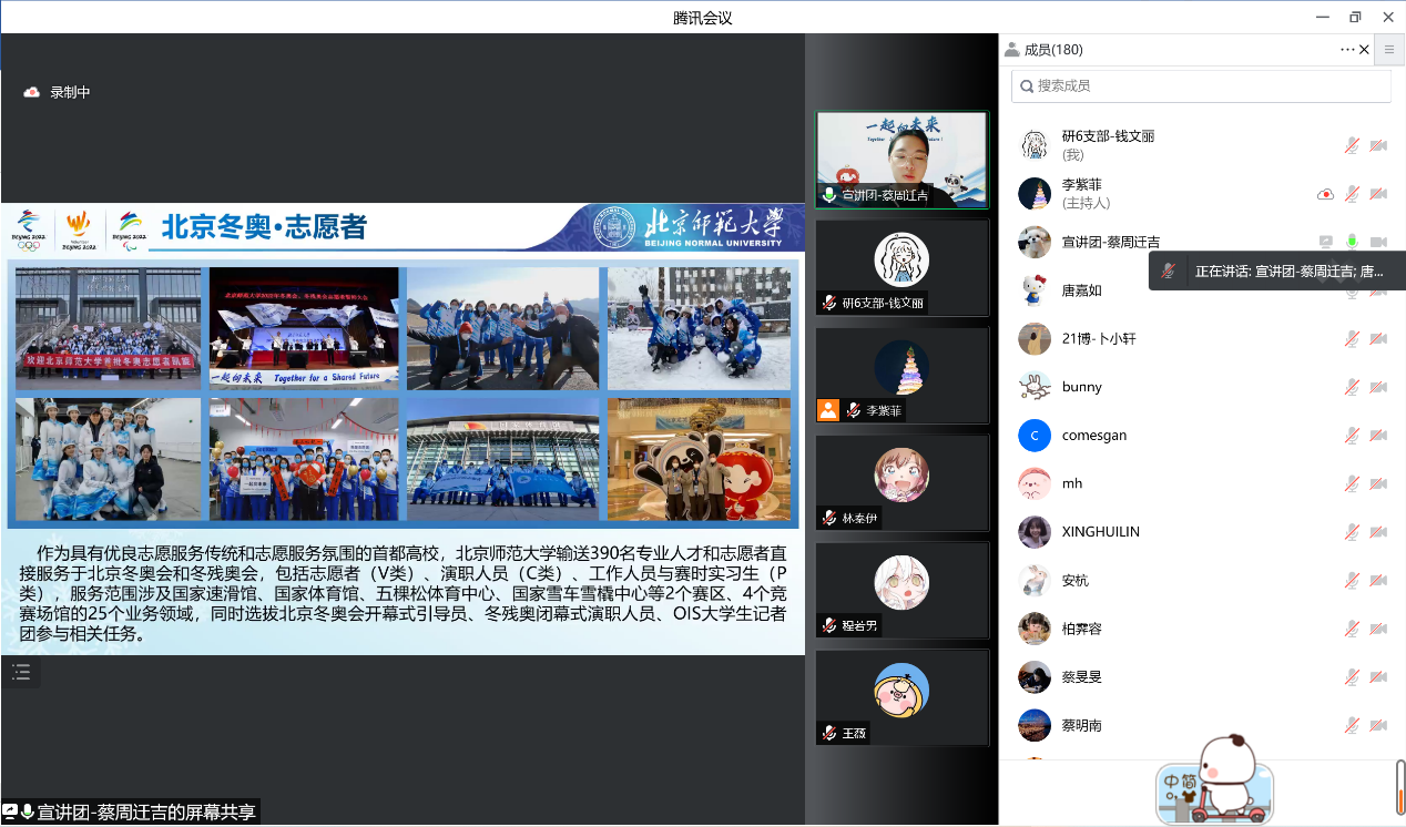 蔡周迁吉作为冬奥微课主讲人,对冬奥和冬残奥会的相关知识进行讲解。主讲人介绍了开幕式中蕴含的中国传统元素,并由吉祥物冰墩墩的元素冰丝带引出对竞赛场馆的介绍,如由水立方改造而来的冰立方,以及会徽“冬梦”和“飞跃”的含义。在对最新的奥林匹克格言和中国体育代表团冬奥夺金纪录片的分享中,主讲人通过快问快答的方式与同志们进行互动。此外,还对我校志愿者的贡献及背后学校的安排与付出,以及习总书记提出的“绿色办奥,共享办奥,共享办奥,廉洁办奥”的办奥理念进行了详细的讲解。